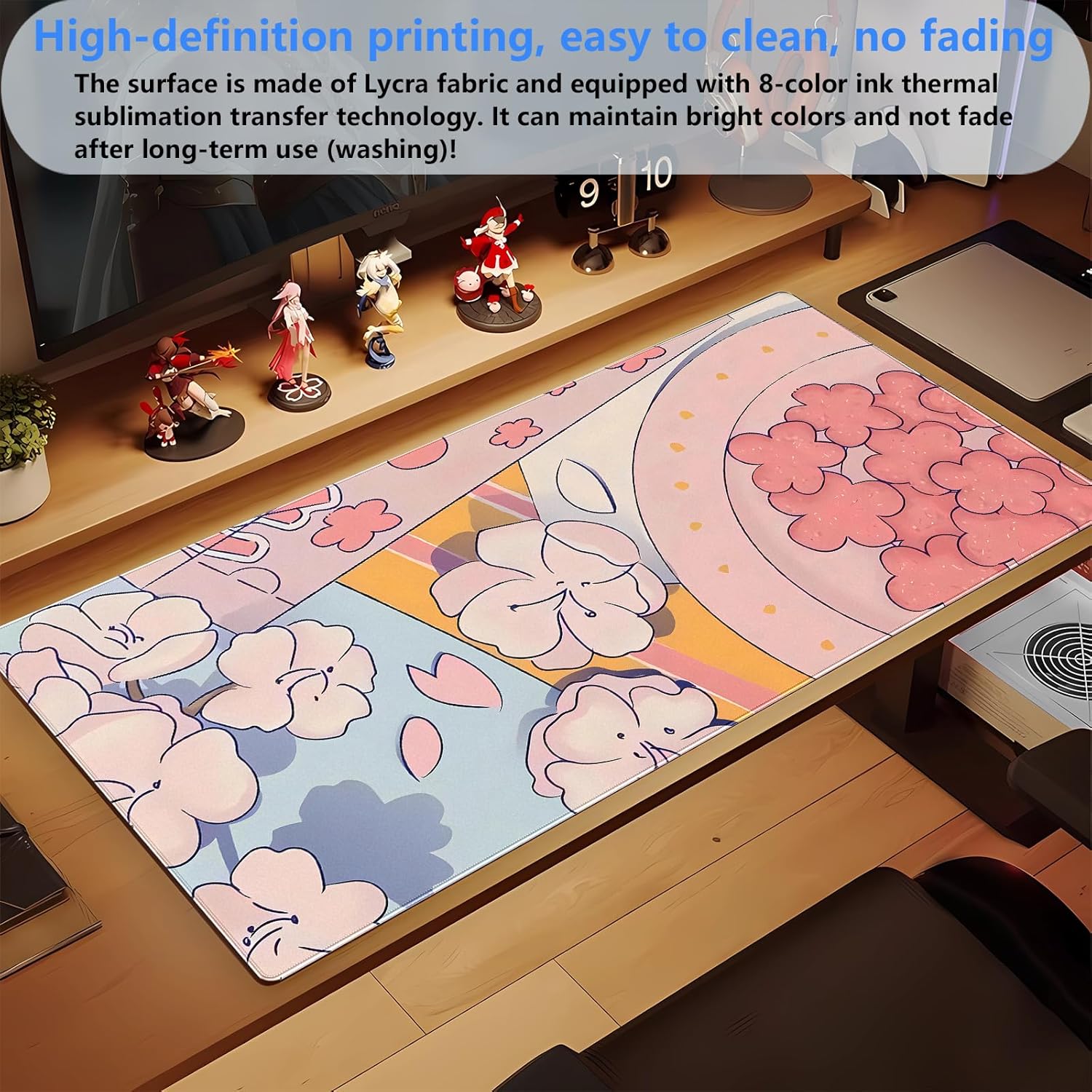Pink Floral Mouse Pad XXL Cute Anime Gaming Desk Mat 31.5"x15.7", Thickened Rubber Base, Stitched Edge & Washable Design for Women, Office, Home