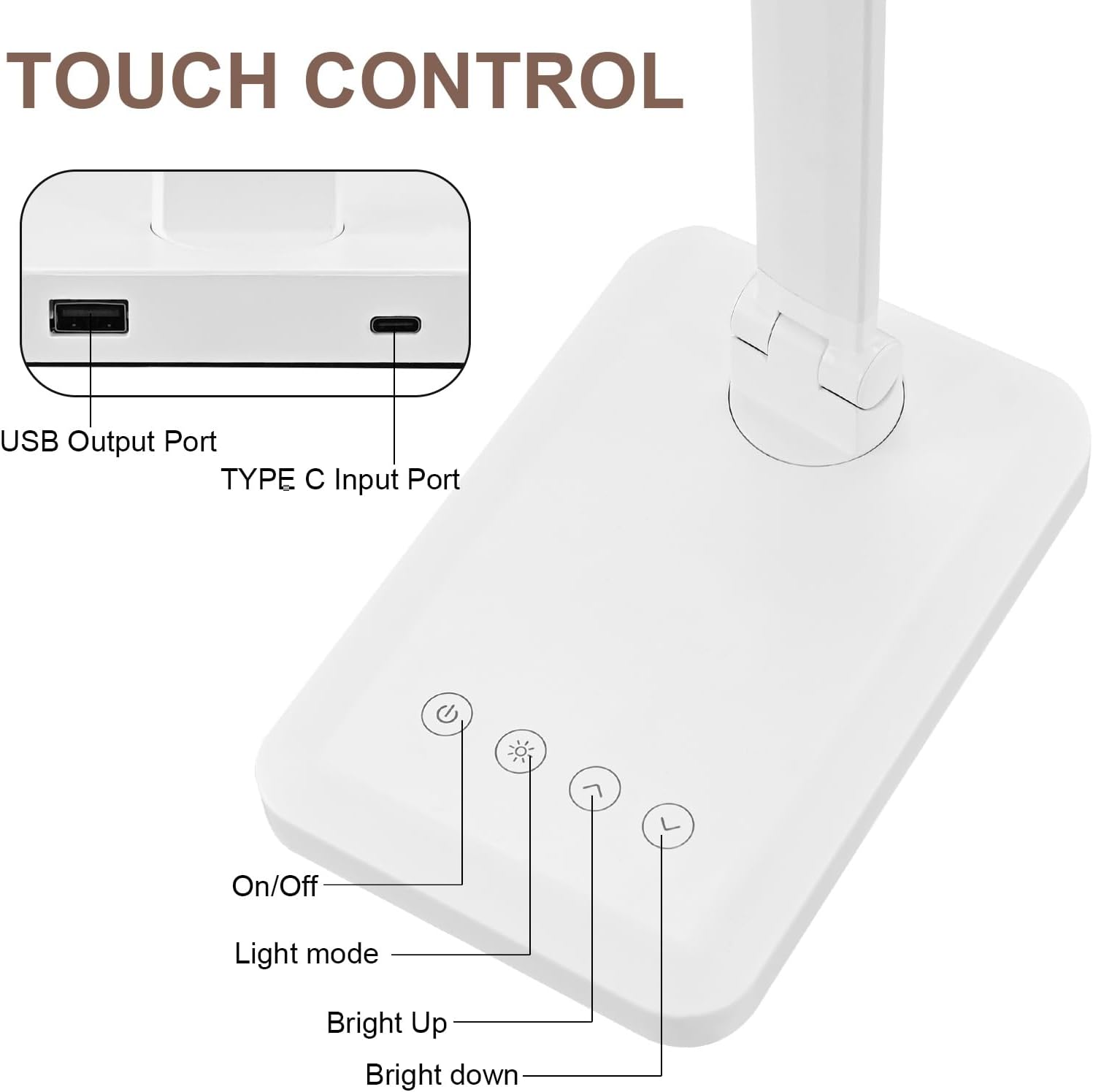 LED Desk Lamp with USB Charging Port Whole White for Home Office Essentials Table Lamp with Eye-Caring 4 Color Temperature Touch Control Stepless Dimming Desk Light for College Dorm