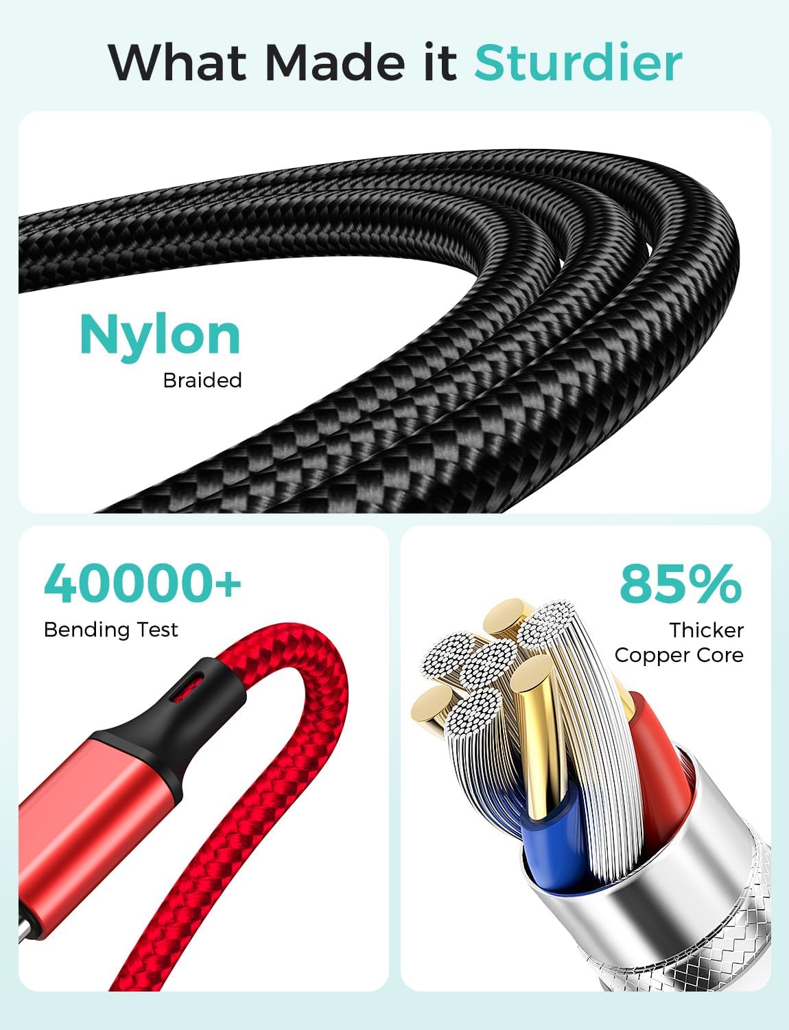 - â„ăHigh Quality MaterialăReplace other inexpensive materials that are prone to dirt and damage with tight nylon threads. Our multi charging cable is more flexible and durable, can bear 25000+ bending test. 3D aluminum connector and laser welding technology, which can ensure the metal part won't break