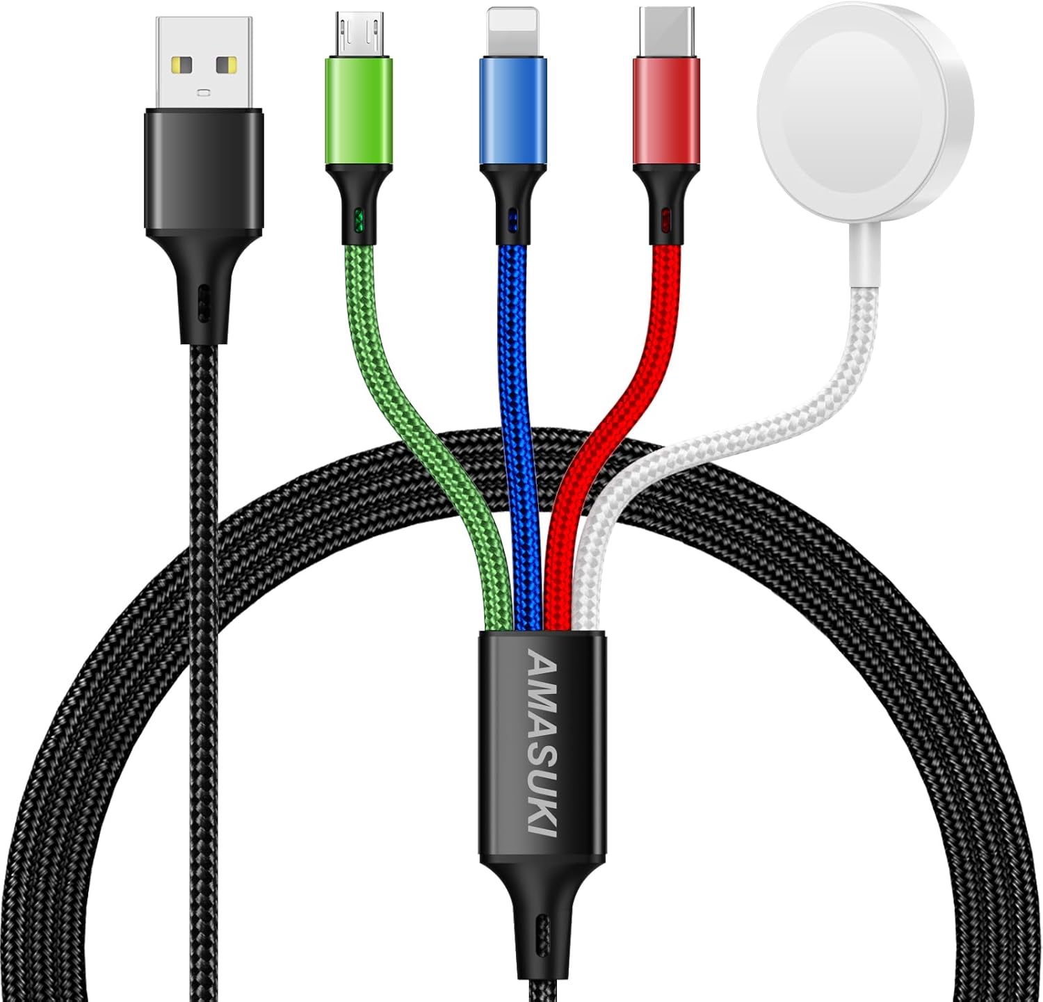 - â„ă4 in 1 Design for TravelăThis multi charger cable with 4 different ports including L/Type C/Micro USB and iWatch charger. Support to charge four devices at the same time, is suitable as a backup charger for traveling