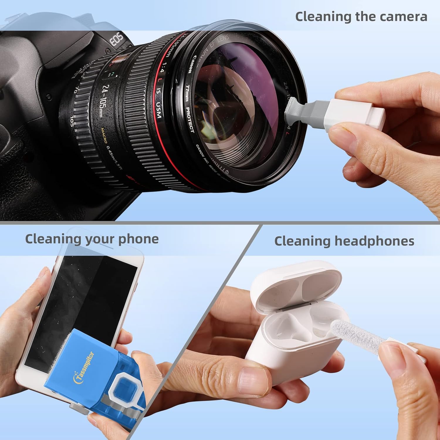 - 【Effectively Cleaning All Your Devices】 Soft brush and Soft plastic lens cleaning pen is especially designed for camera screen, lens and other delicate surfaces. 5 more cleaning cloth of it supplied for replacing. The flocking sponge is an excellent tool for cleaning headphones charging cases, while the metal pin tip and high-density brush are ideal for cleaning the sound outlet holes on earbuds. Keep your smartphone, camera lens, laptop, headphones and other electronic accessories clean