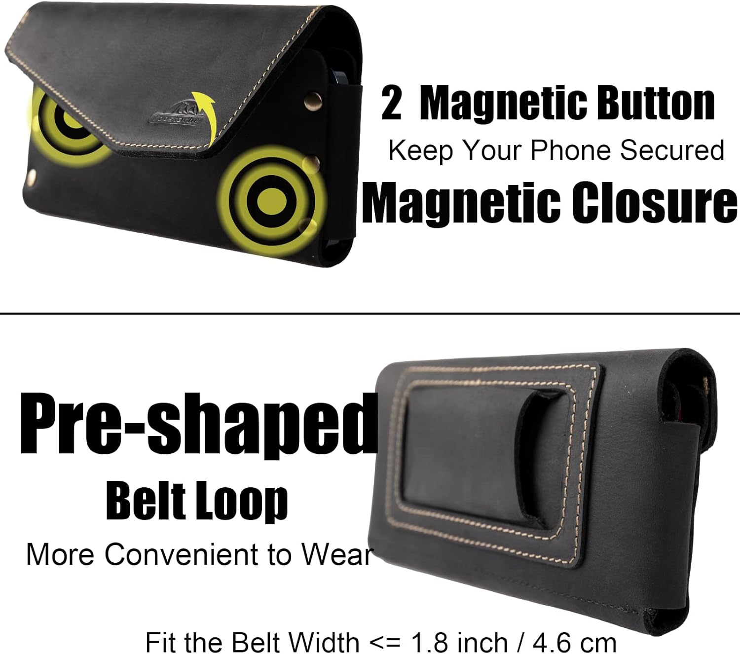 topstache Leather Phone Holster with Belt Loop, Magnetic Closure Cell Case Card Holder Wallet,Leather Pouch for iPhone 14 Pro,Galaxy S23(Fits Otterbox on) L,Black, Belt Loop-Black (C0403)