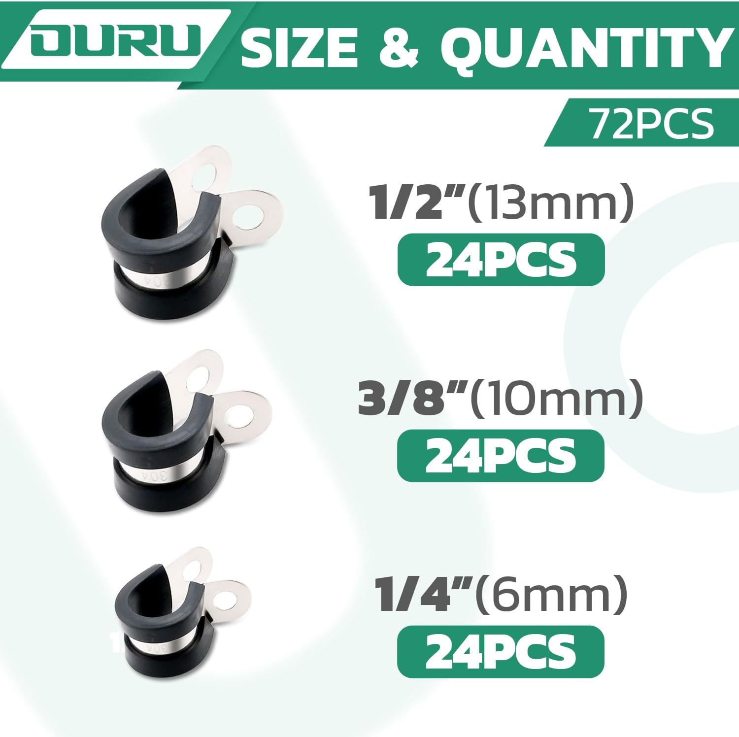 - 72PCS Cable Clamps Assortment Kit —The stainless steel cable clamps assorted box including 3 different sizes,24pcs 1/4’’(6mm),24pcs 3/8’’(10mm),24pcs 1/2’’(13mm),various sizes are available to meet your needs