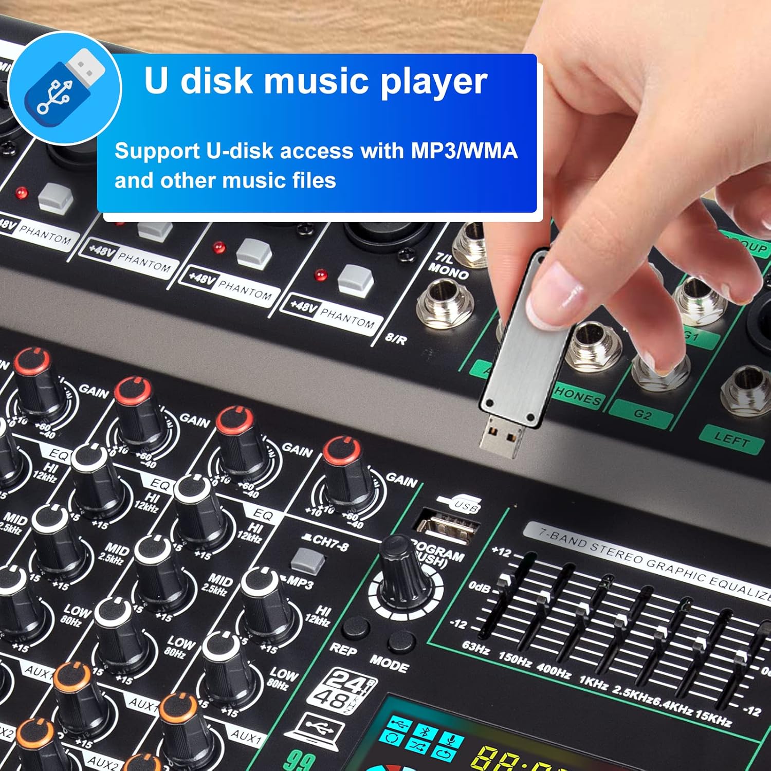 Depusheng TG8 professional dj audio mixer 8 channel input and dual group output with 99-bit dps reverb chip bluetooth usb recording and mp3 playback suitable for stage, bar, recording studio