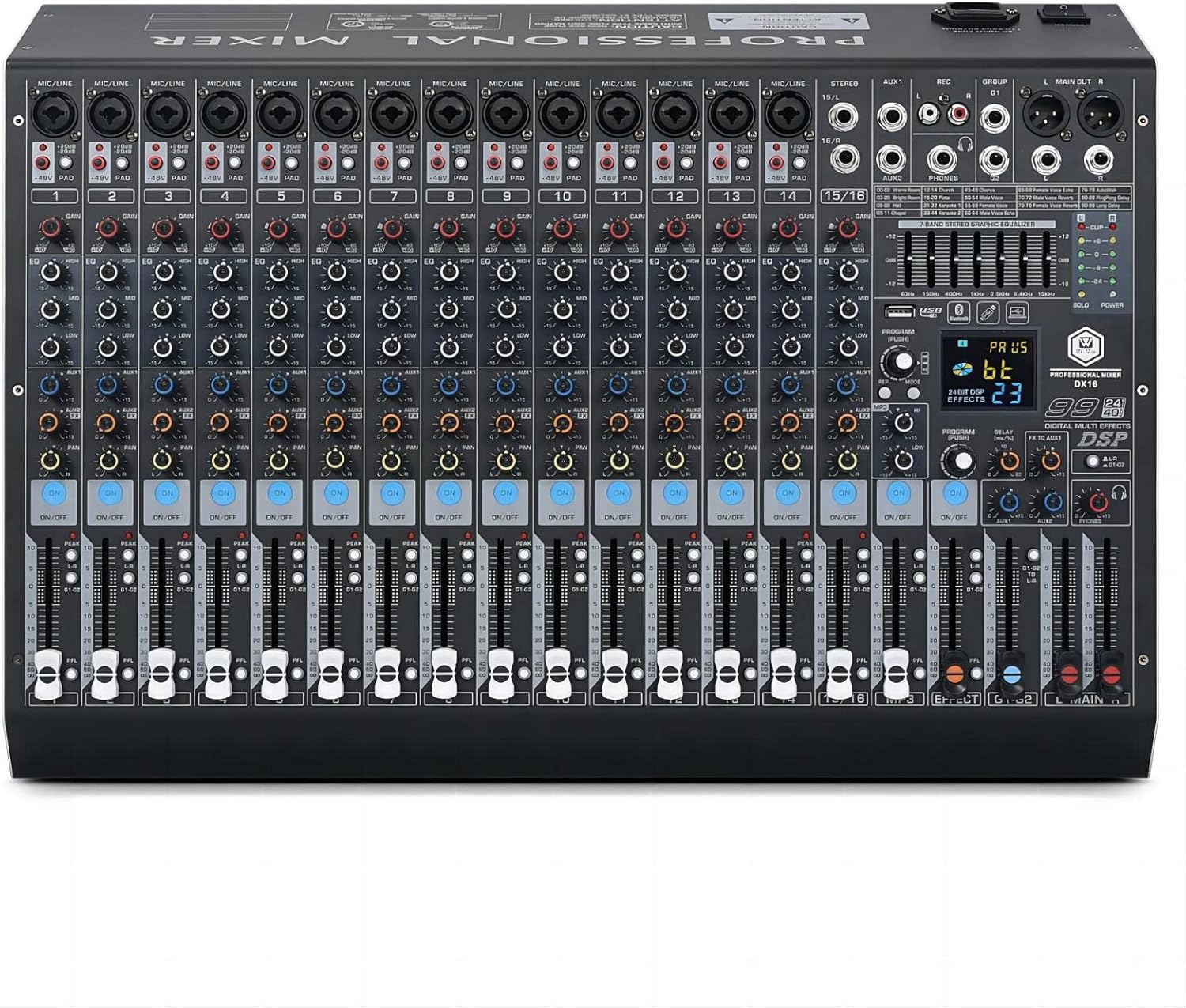 W IN-MIX DX16 Professional DJ Audio Mixer 16 Channel with 99 DSP Effects,7-band EQ,Independent 48V Phantom Power&Mute Button,Bluetooth Function,USB Interface Recording For Studio & Stage