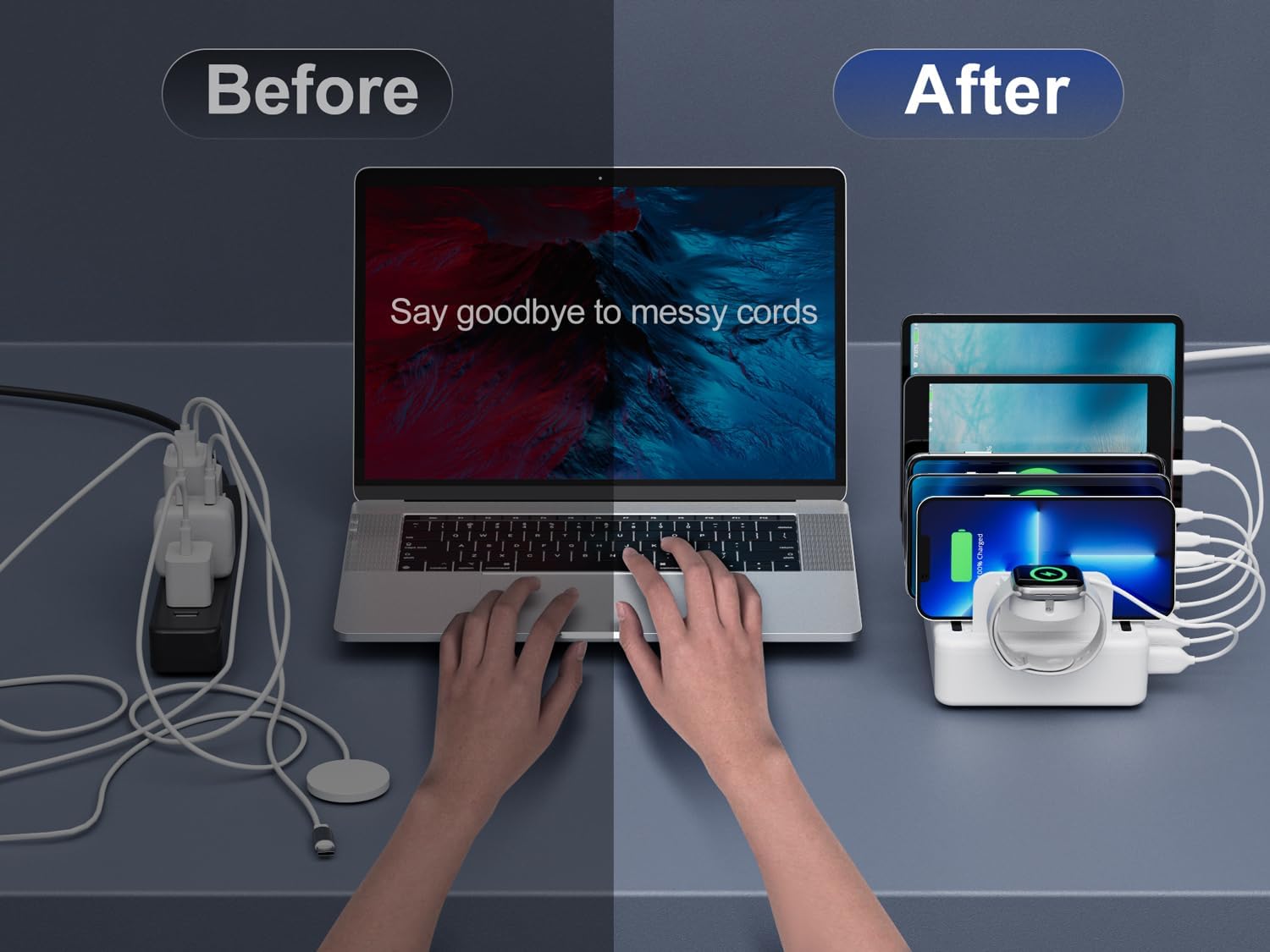 - Perfect Gift For Any Occasion: This compact-size desk top Charging Station Organizer keeps all of your devices charged in one central, great use for any occasion like your family home, kitchen counter, nightstand, end table, bedside table, workspace, office, classroom, hotel, travel, etc. Our charging dock for multiple devices makes a great gift choice for anyone you love