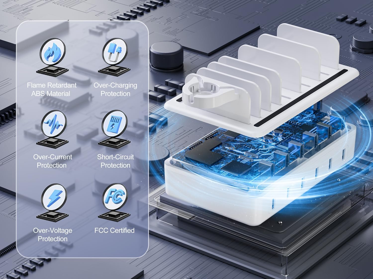 - Fast Charging & Smart IC: Our charging station for multiple devices features a smart chip that instantly recognizes any connected device and offers exactly the charging current required to match your device's needs. Each port provides Max out of 2.4A which is 3 times faster than a regular charger station of 2A or less, with an output of 50W maximum power, It only takes 35 minutes to charge your mobile device to 50%, ensuring safe and efficient charging
