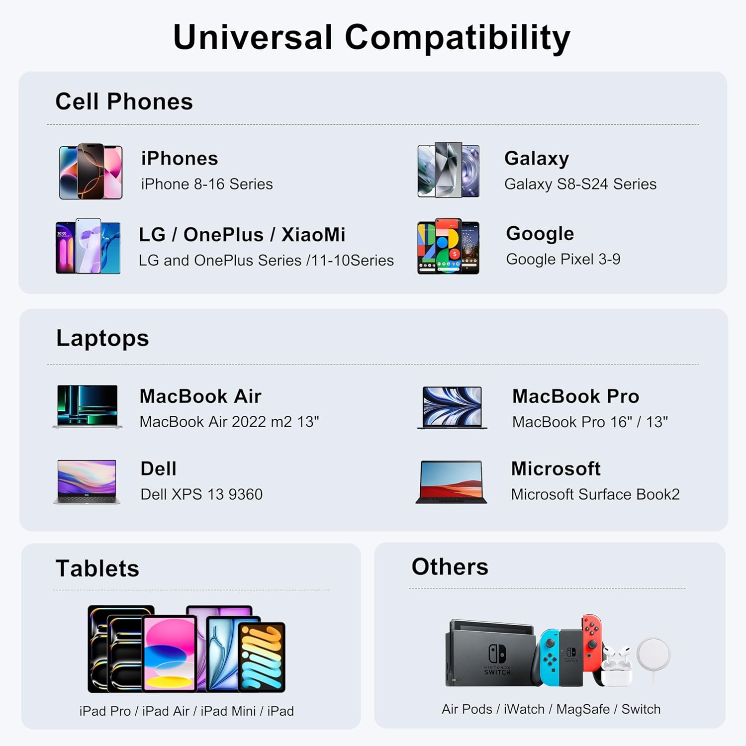 - ⚡【Universal Compatibility】Say goodbye to your old chargers, this USB C charging station meets your daily charging needs. USB C Fast Charger Block compatible with MacBook Pro MacBook Air MacBook iPhone 16/16 Plus/16 Pro/16 Pro Max iPhone 15/15 Plus/15 Pro/15 Pro Max iPhone 14/14 PRO/14 PRO MAX/13/ 13 Mini/ 13 Pro/ 13 Pro Max iPhone 12/ 12 Mini/ 12 Pro/ 12 Pro Max/ XS/ XS Max/ XR/ X/ 11/ 11 Pro/ 11 Pro Max/ Samsung Galaxy S23 Ultra/ S22/ S21+/ S21/ S21 Ultra/ S21 FE/ S20+/ S20/Dell XPS 15/ 13 Google Pixel iPad Pro iPad Mini Series/ iPad Air Series AirPods Pro