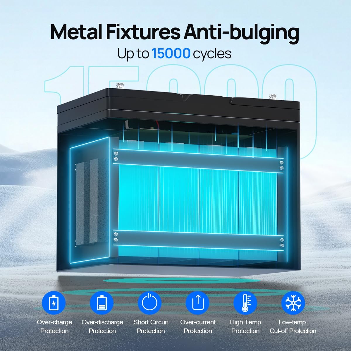 - 10 Years Life & Up to 15000 Cycles: The 12V 100Ah lithium battery uses a Class A LiFePO4 battery, which has passed UL/UN38.3 test certification and has the highest safety level. The battery has up to 15,000 cycles and a service life of 10 years. In contrast, lead-acid/SLA/AGM batteries typically only last 3 years with 200-500 cycles