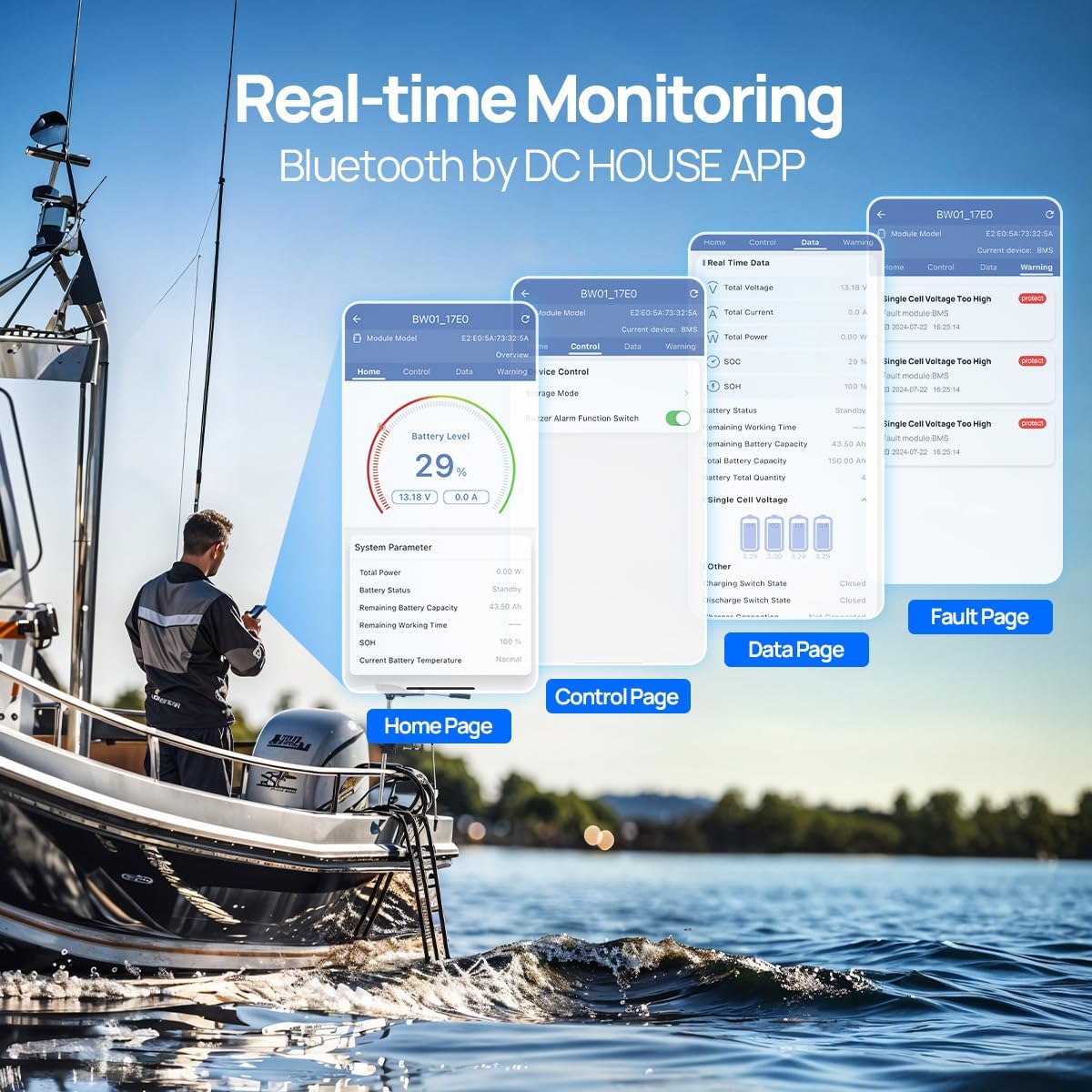 - Bluetooth APP Monitoring: DC HOUSE 12V100AH battery has built-in Bluetooth, which can connect with DC HOUSE APP (Bluetooth signal range 5-10 meters. It is convenient to monitor battery information such as SOC, voltage, current, etc., and the data is accurate to the specific cell of a battery, there is a special fault display page to help troubleshoot.