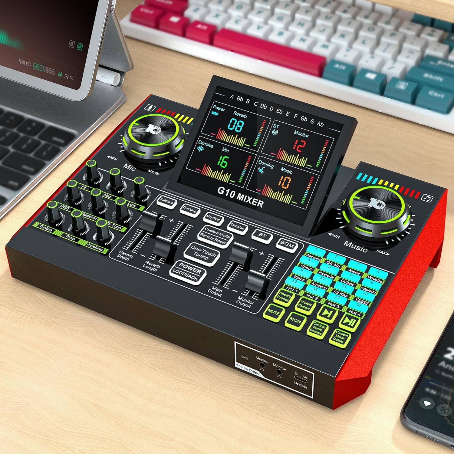 - 【Voice Changer with Customizable Effects】The G10 sound mixer includes a voice changer that lets you switch to female, deep, baby, or magic voices. You can also adjust bass, treble, reverb, and more to create a fully personalized sound, adding fun and interactivity to your streams or recordings