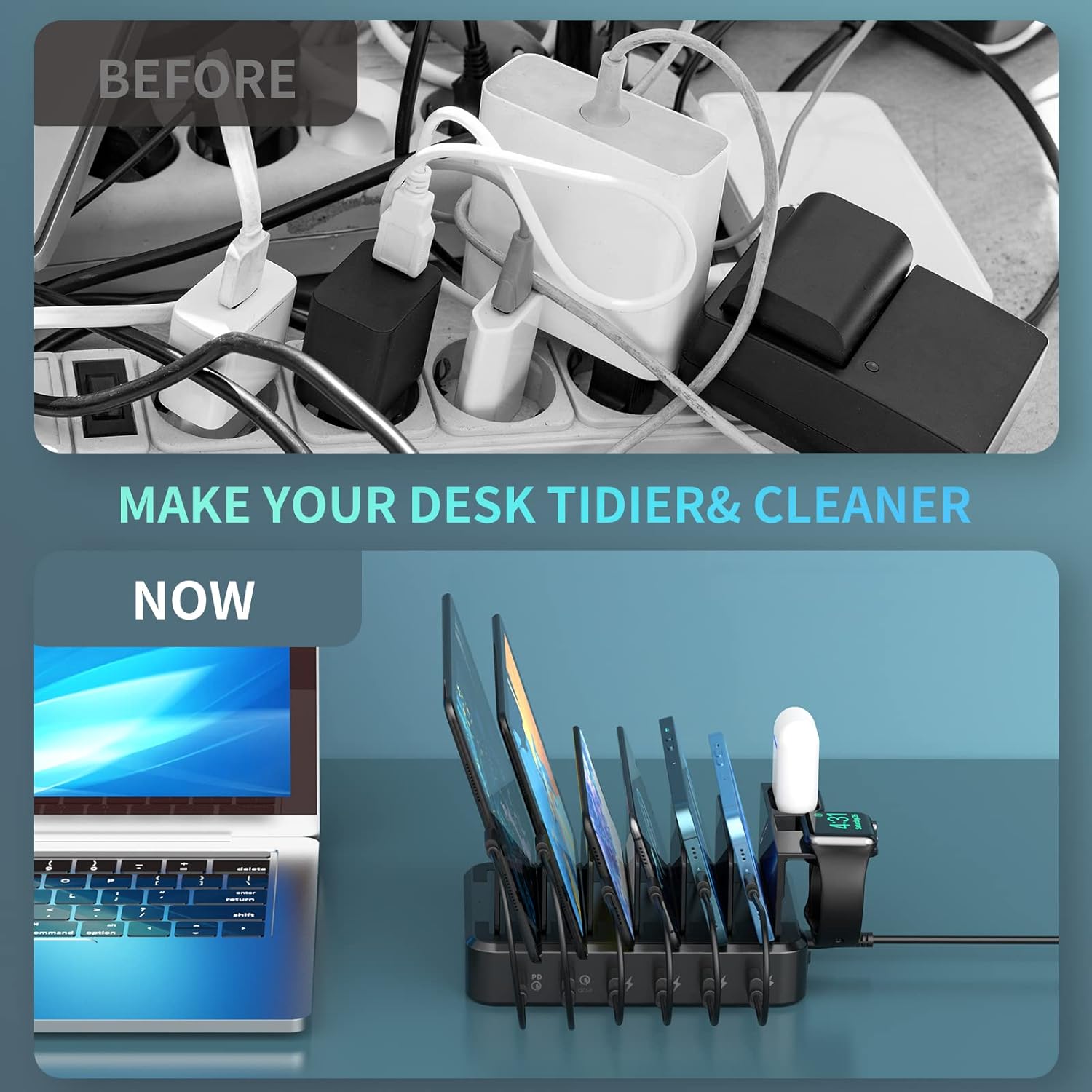 - ă7 in 1 Charging Stationsă: 6 ports Charging Station designed with and With the new holder for iWatch Charger & Air-pods (PLEASE NOTE: the Watch charger is not included) conveniently store and charging for any 6 devices combination. By one 6 port USB charger station, No more cluttered cables & do not need to plug a bunch of wall chargers on your power outlet,keeps your table nice and clean.and freed up outlets in your home and office.