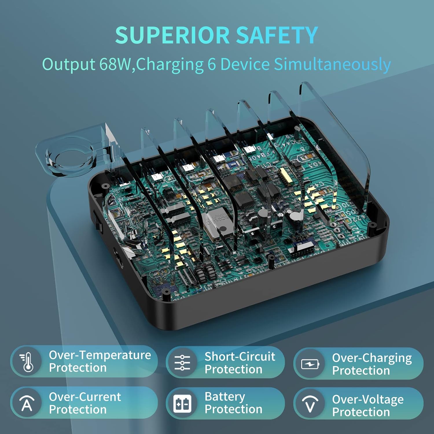 Charging Station for Multiple Devices,68W 6 Ports USB Charger Station with 20W PD USB-C Fast Charging,8 Short Charging Cables Included,Compatible with iPhone 15/14 /13/12, Galaxy iPad,Tablets