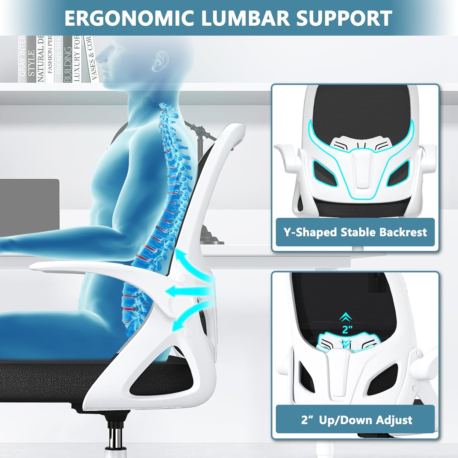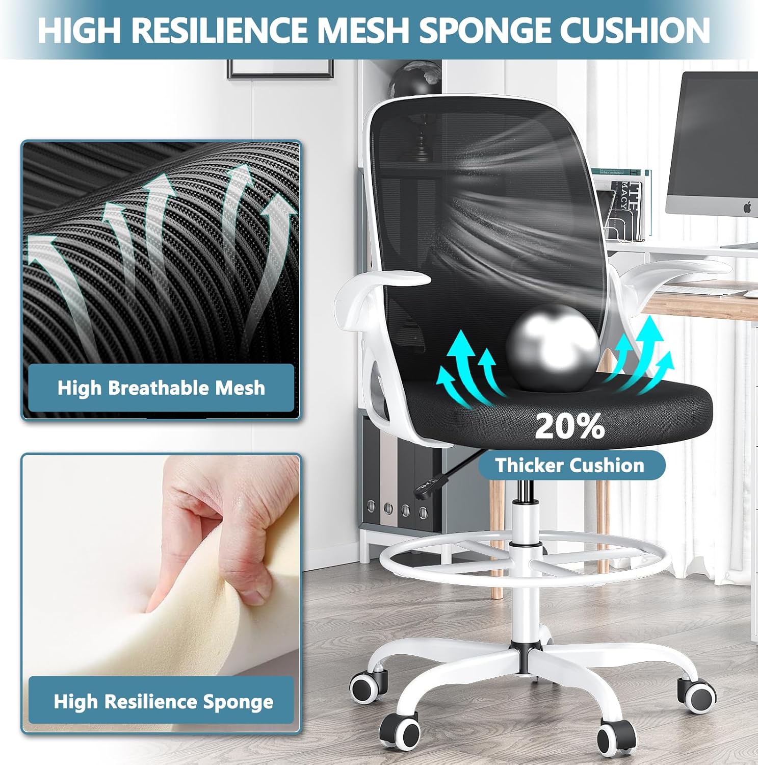 Tall Drafting Chair with Footrest Ring for Home and Work, Ergonomic Home Desk Office Chair with Flip up Arms and Lumbar Support, Extended Height Executive Desk Office Chair(White)