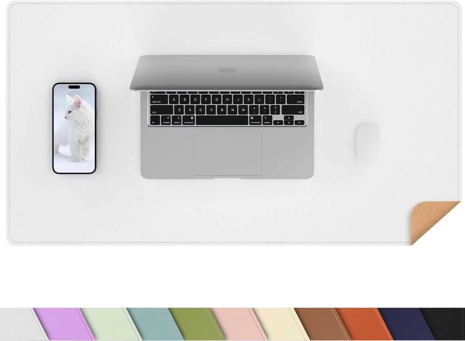 Leather Desk pad Protector, Large Desk mat with Natural Cork & PU Leather,Mouse pad,Non-Slip Office Desk Mat,Waterproof Desk Writing Pad for Office and Home (35in*17in, White)
