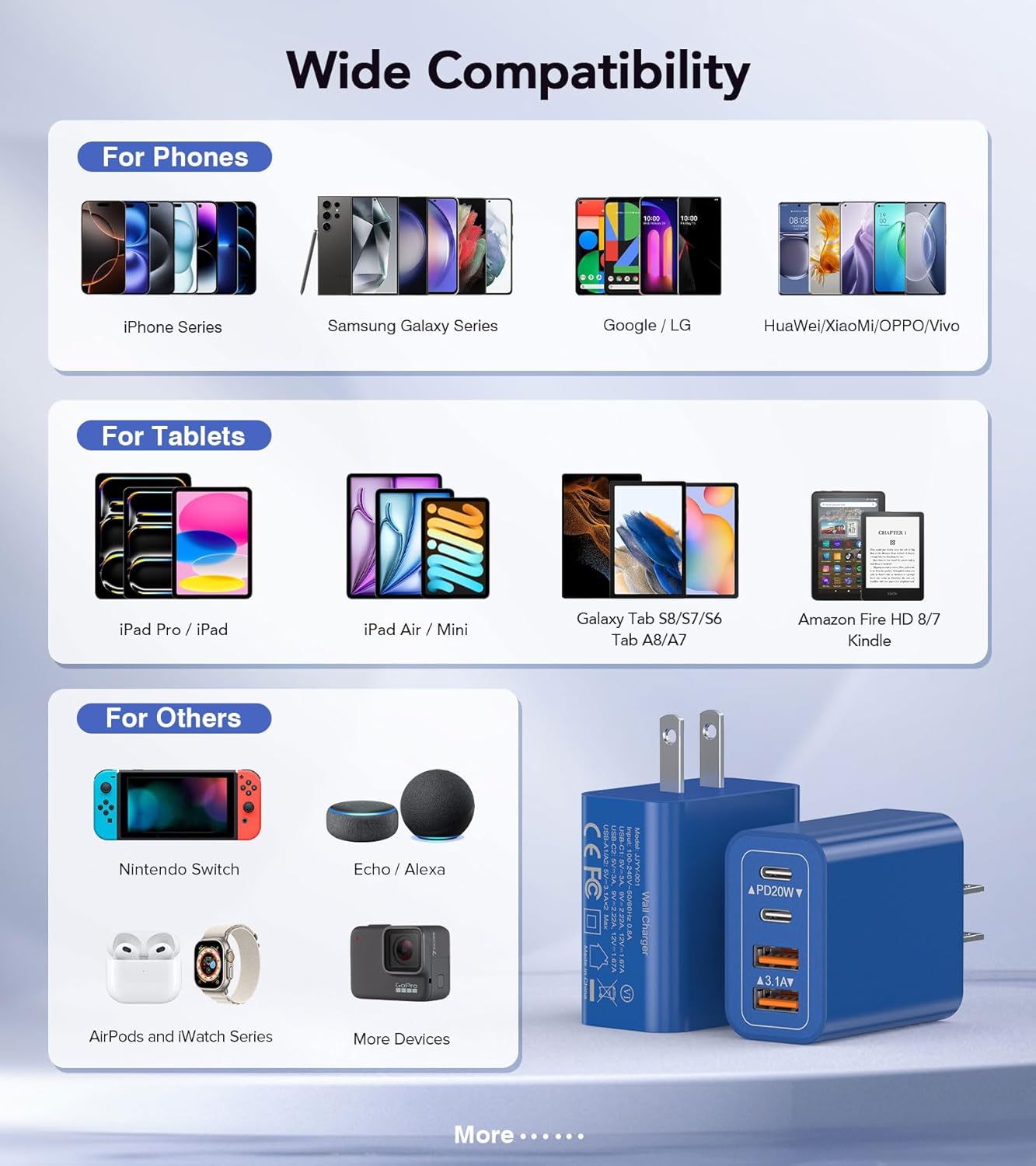 - Universal Compatibility:Due to the special 4-port,the USB charger is compatible with almost all electronic devices,charging adapter for iPhone 16/16 Pro/16 Pro Max/16 Plus/15/15 Pro /15 Pro Max/14/14 Pro/14 Pro Max/13/13 Mini/13 Pro Max/12/12 Pro Max/12 Pro Max/12 Mini/SE 2020/11/11 Pro/11 Pro Max/XR/XS/X/8/7,iPad Air/Pro/Mini,Samsung Galaxy S22/S21/S20/S10/S9/S8/A12/A13/A22/A32/A52/A53/A71/Note 20 10,Tablets,LG,Motorola,Google Pixel and other digital devices compatible