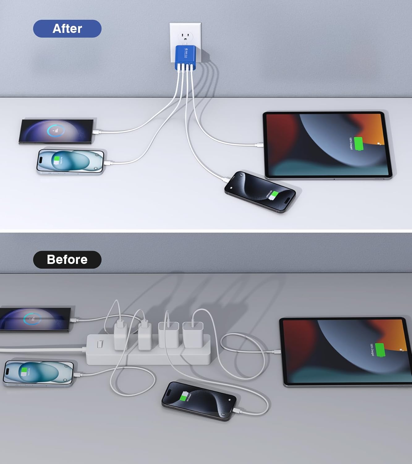 - Multiport Charging: The charger block has Dual USB-C ports and Dual USB-A ports. Allow users to charge phone, tablet and headphones simultaneously to minimize waiting time. Itβs also a great space saver instead of taking up 4 wall outlet ports. The best replacement for your original usb charger