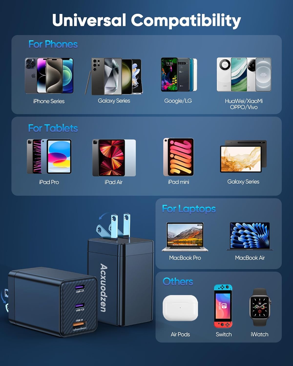 - 【USB C Charger Block 3 Port】: Acxuodzen usb c charger block 3 ports with dual 65W type c charging ports & one 30W USB-A charging port(160W Total). The 65W high power charging port can charge your laptop fast and also provide super fast charge for your phone, iPad, iWatch, Switch and other electronic devices. Faster charging speed than regular 20W/30W/40w/45W chargers, greatly shortens your charging time. Our 1 charger block equivalent to 3 single-port charger blocks, can save your outlet space.
