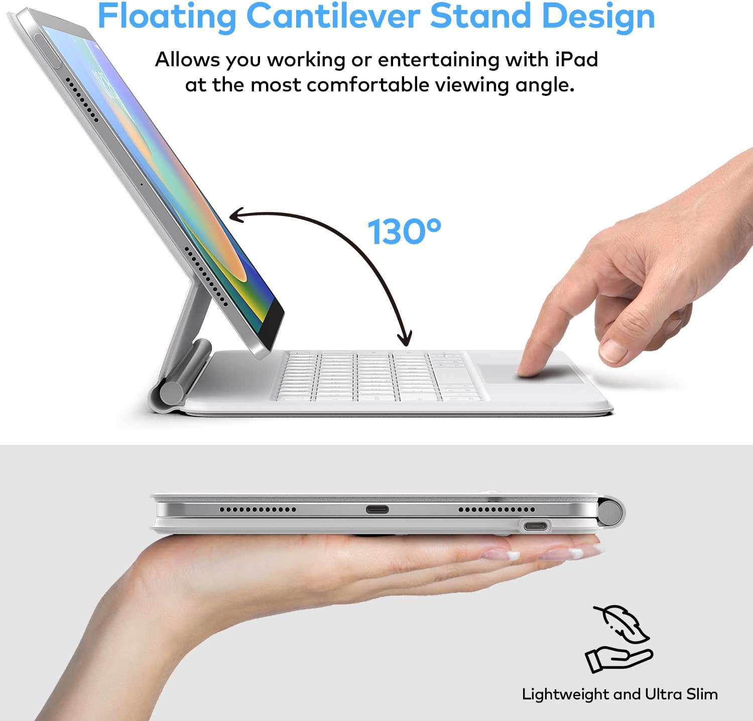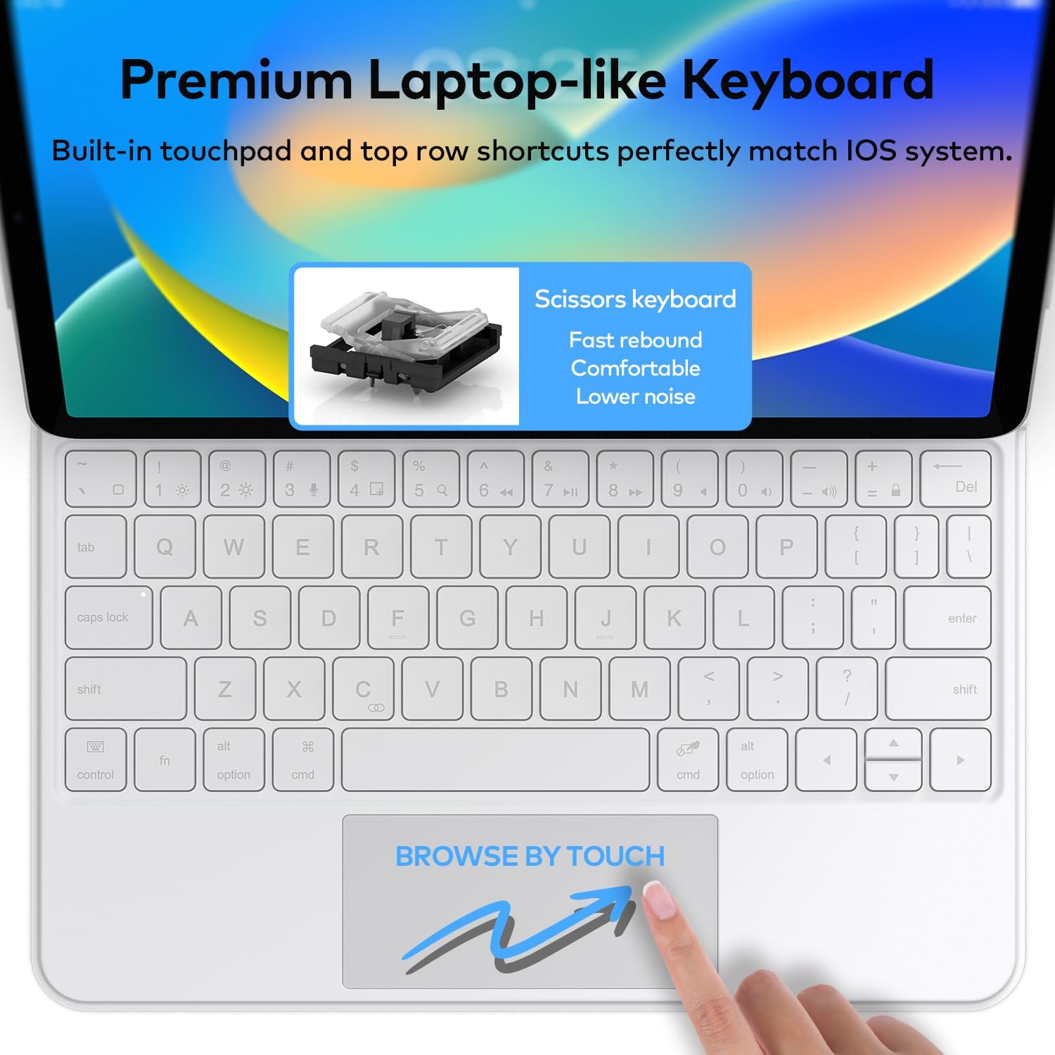 - Easy-Set Magnetic Stand: you can attach your iPad 10th generation to the keyboard back case magnetically, Set the floating cantilever stand with one smooth motion, and transform your iPad into a highly performant and easy-to-use laptop within a second! Which is perfect for traveling, business, and school.