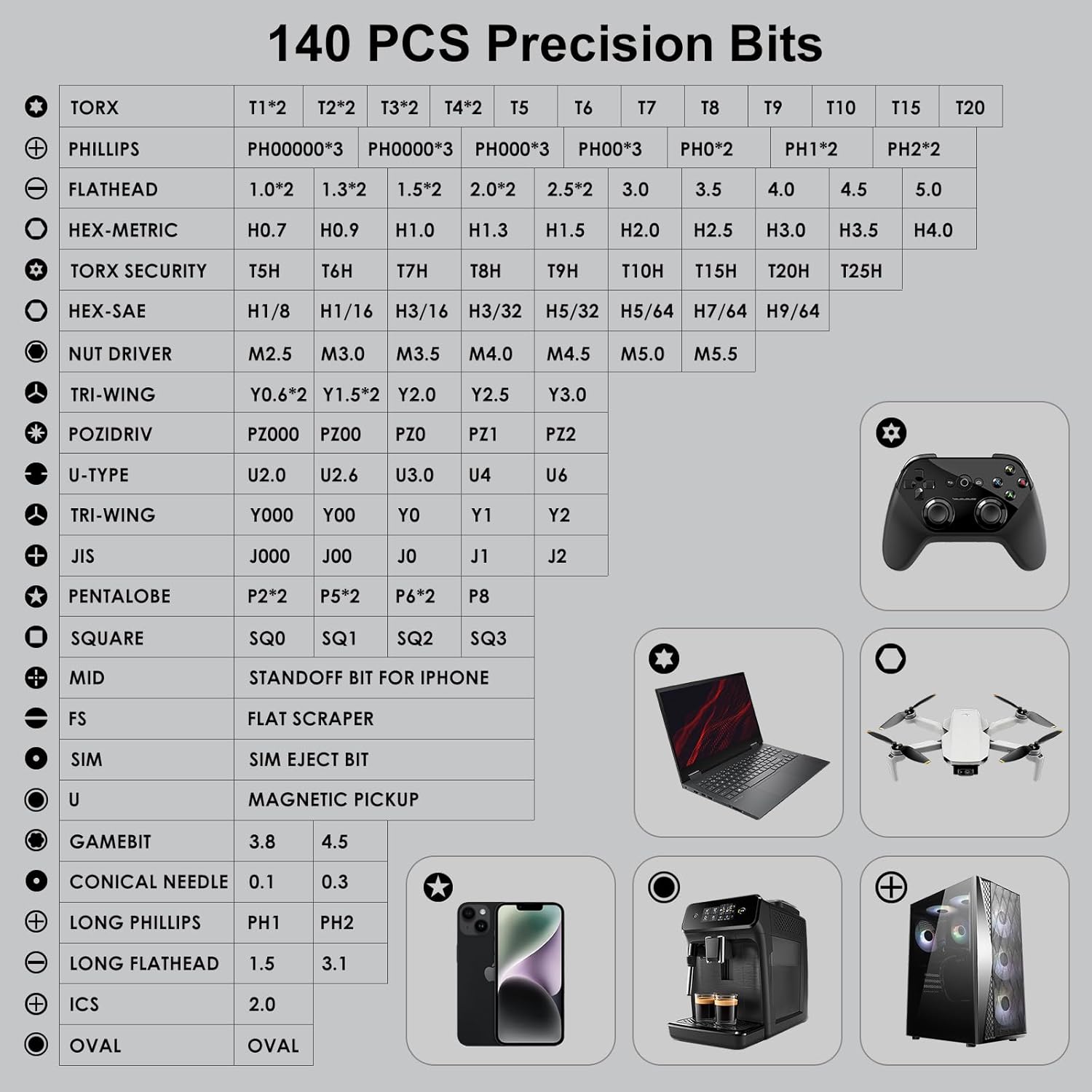 - 【Wider Application】The STREBITO Precision Screwdriver Set is professionally designed for electronic repair. With 140 precision bits - Phillips, Pentalobe, Torx Security, Star, SAE/Metric Hex, JIS, Flat Head, Triwing, Triangle, Square and more, this screwdriver kit is versatile to meet your different daily use, such as PC, Computer, Laptop, Cell Phone, Macbook, RC Car, Drone, Nintendo switch, PS4 Controller Console, Watch, Eyeglass, Coffee Machine, Ring Doorbell, and other IT tech devices