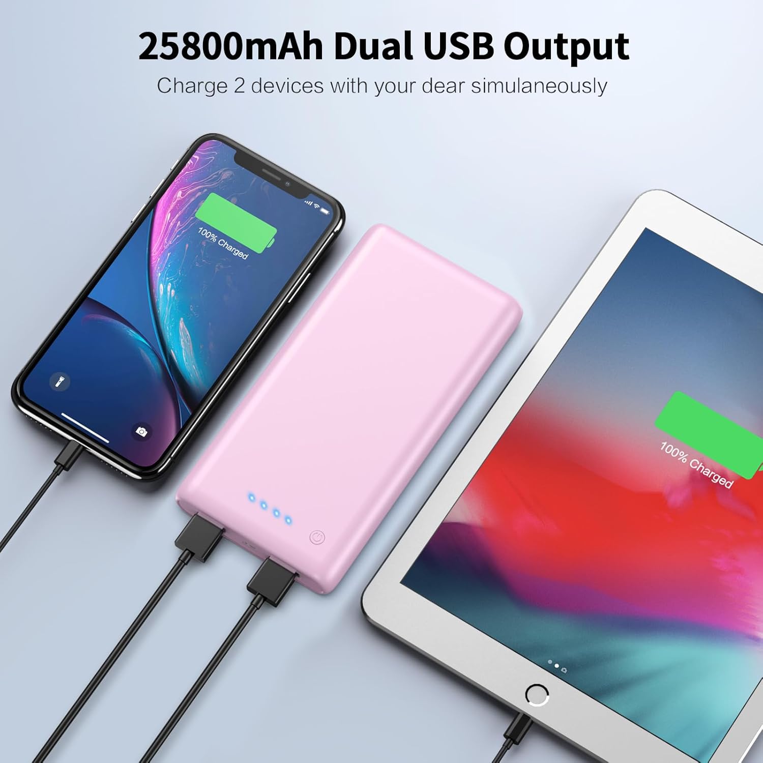 - â€ă26800mAh Colossal Capacity & Widely CompatibilityăMassive Powerful 26800mAh Potable charger can charge most phones over 6 times, tablets at least 2 times and any other USB device multiple times. Universal Compatible with iPhone, all Android smart phones(Phone 6/7/8/7plus/8plus/6plus/x/xs max/11/11 pro/12/12 pro max/13/14/15/16 Series), tablets, mp3/mp4 players and other USB-charged devices.//