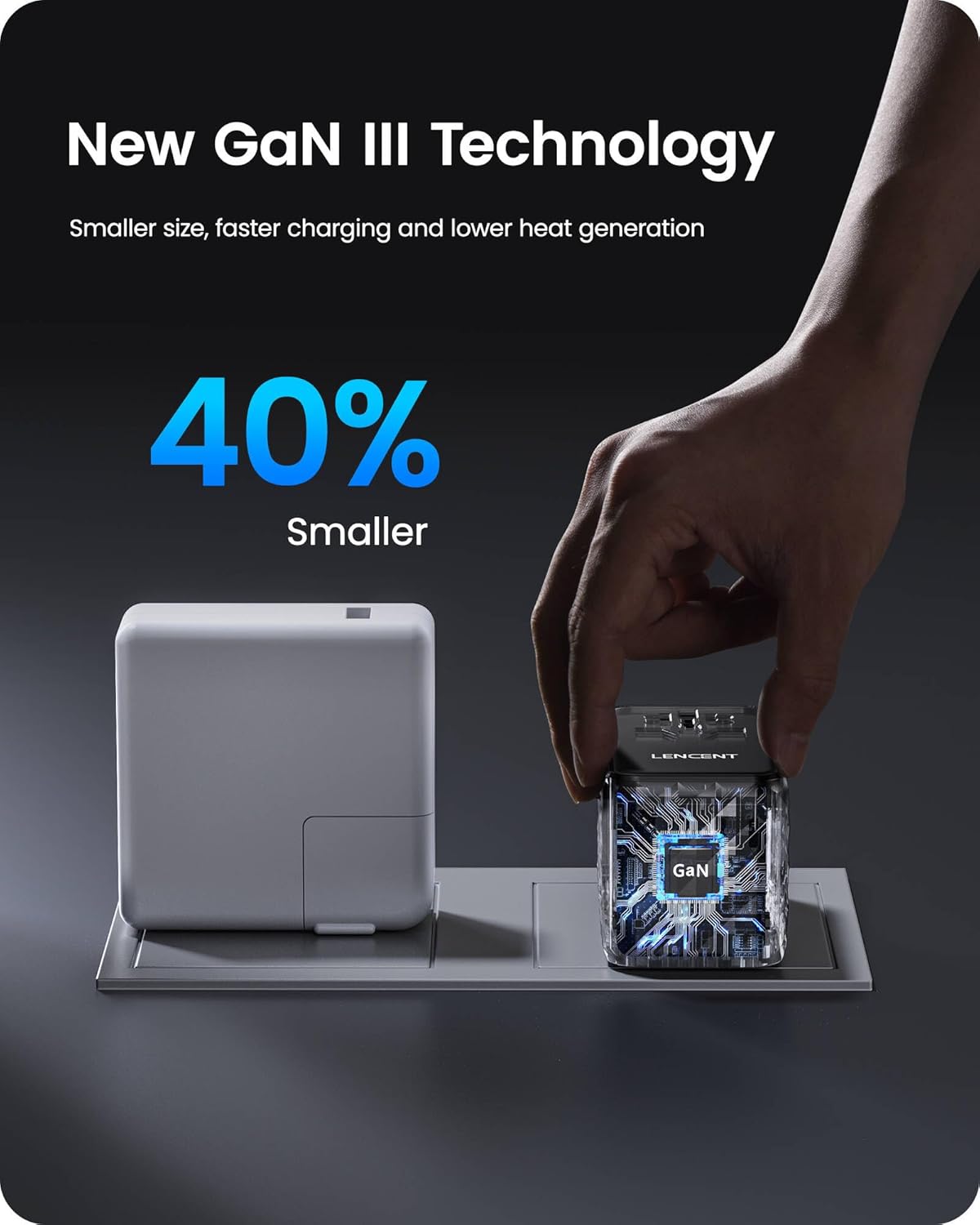 - Advanced GaN III Technology: Featuring GaN III technology, this worldwide travel adapter is compact, efficient, and generates less heat. It outperforms traditional chargers with faster charging, lower temperatures, and a built-in multi-protection system for safer, high-performance charging