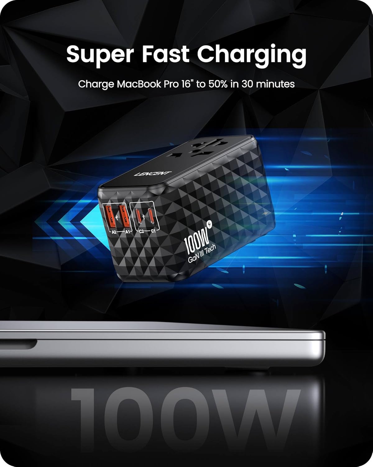- 100W USB-C Fast Charging: This universal travel adapter delivers 100W USB-C fast charging, powering phones, tablets, and USB-C notebooks efficiently. It fully charges a MacBook Air M2 in under 2 hours, offering smart charging technology for optimized power output and extended battery health