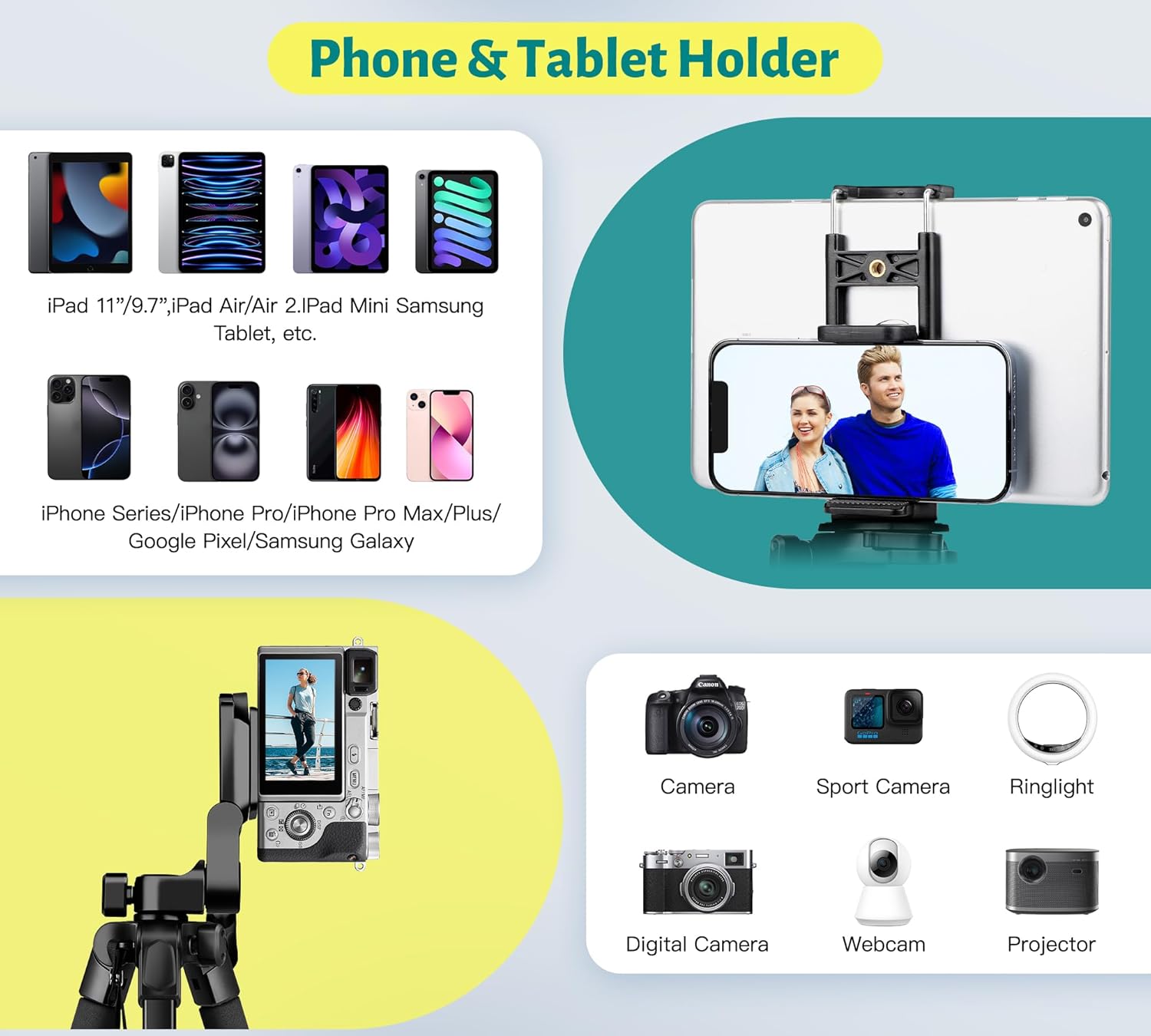 - 【Wide Compatibility】 Tripod stand with a 2-in-1 universal holder compatible with iPhone15 14 13 12 11 Pro/XS/XR, Samsung Galaxy, IPad Pro 9.7"/10.5"/ 11.9", iPad Mini. And 1/4 screw can set up Nikon, Canon, other digital cameras, projectors, spotting scopes, ring lights. Phone tripod is suitable for recording videos, live streaming, YouTube, video conferencing, and online meetings, vlogging, selfies, group photos, family photos...(NOTE: The tripod comes with a tablet holder and is only suitable for tablet devices within 11 inches.)