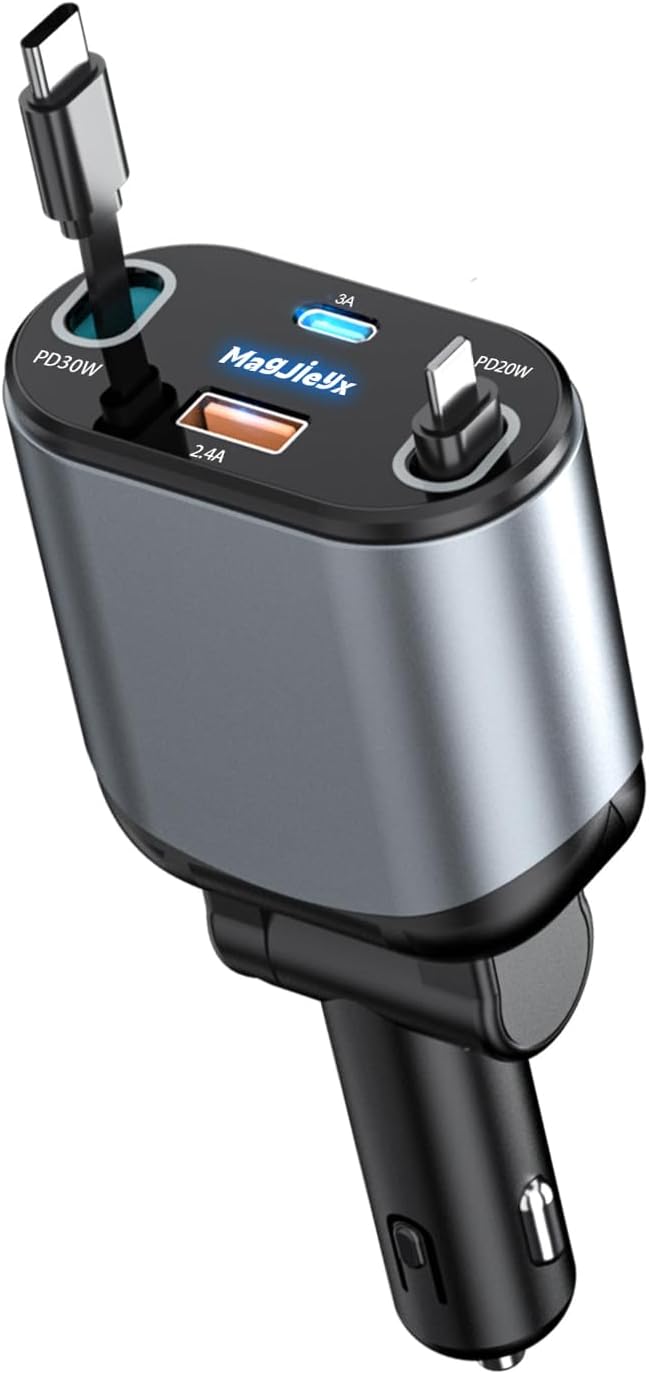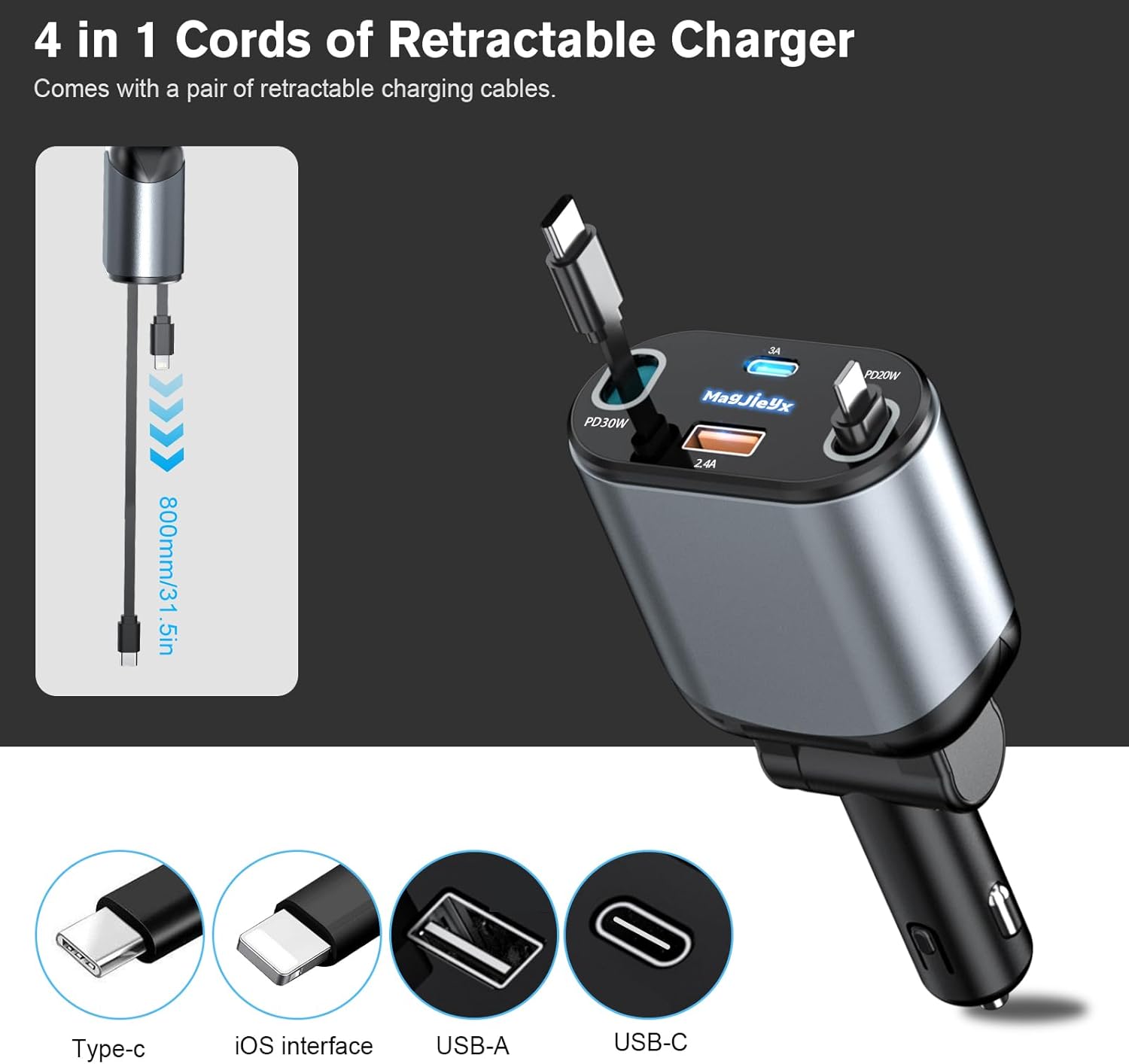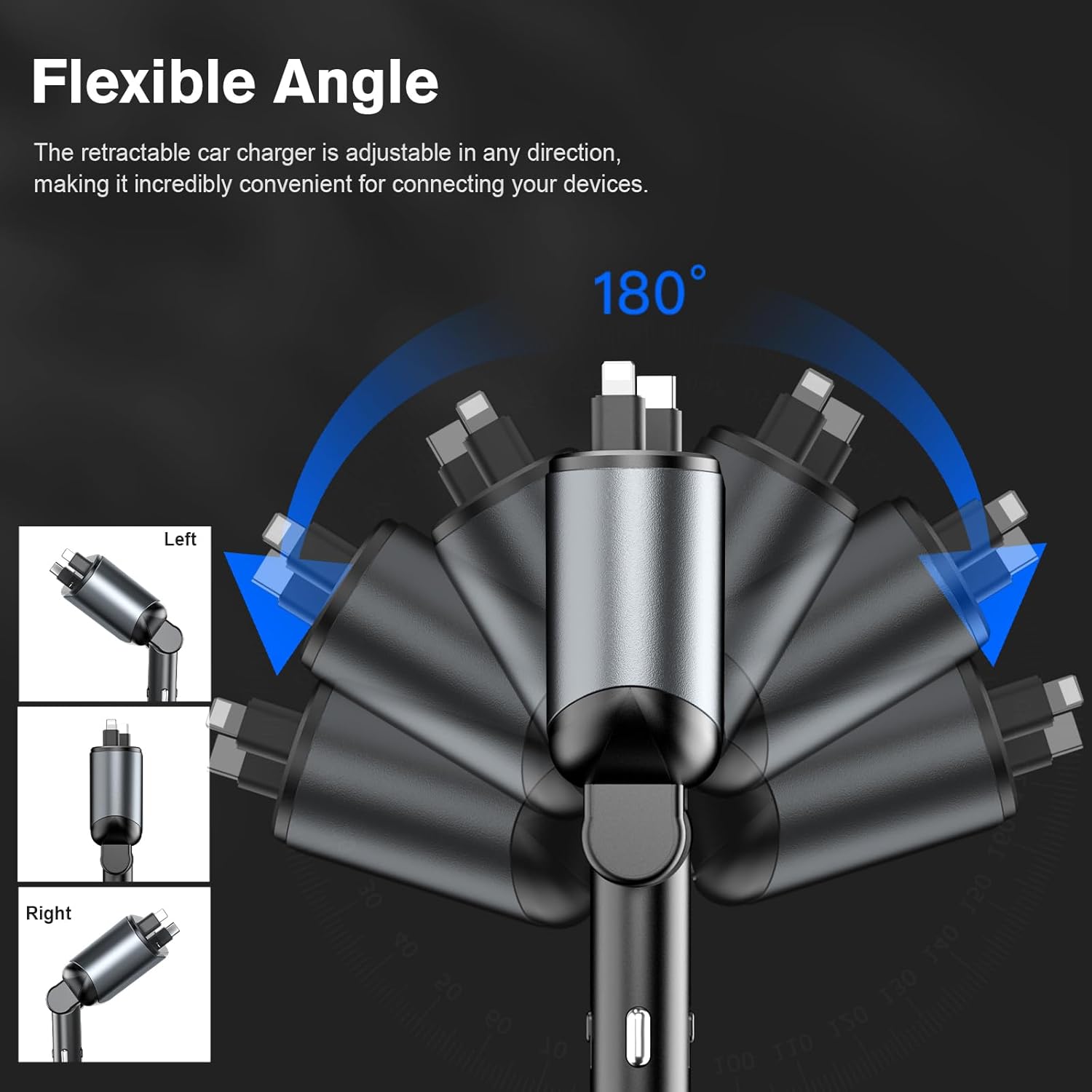 - ă4 in 1 Charging CordsăThe fast car charger adapter for iPhone simultaneous fast charging of up to 4 devices. Include 2 retractable cables (Type-C and Apple Cords) with 7 adjustable length settings, as well as 1 USB-A and 1 USB-C port .