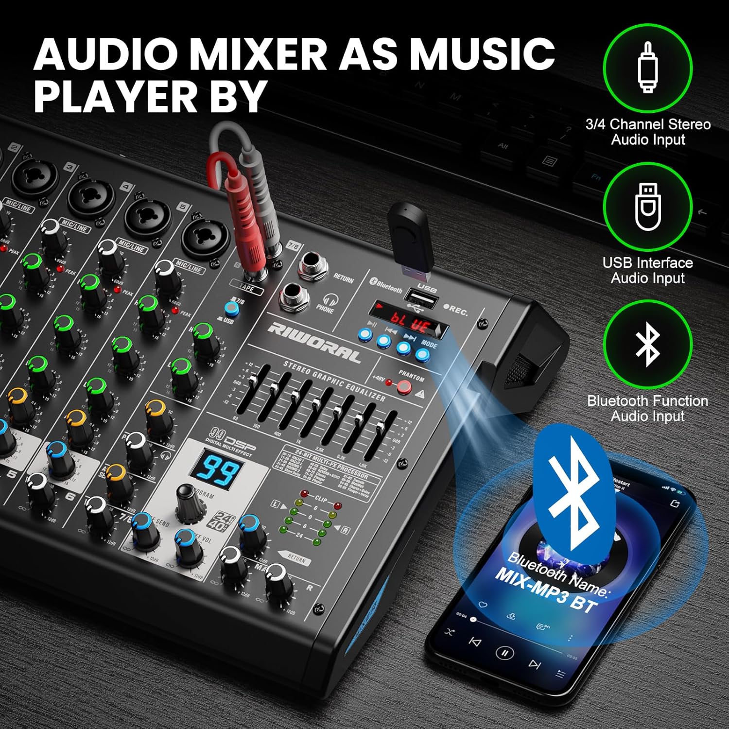 - 🎤【Built-in 99DSP Effects Processor】Sound Mixer Has Built-In 99 Kinds Of Dsp Effects With 40khz/24bit Hi-Res.You can switch to the corresponding DSP effect for more different scenarios,This incredibly versatile mixer is great for high quality on stage performance, live gigs and party.You can even add delay or reverb effects in your mix.