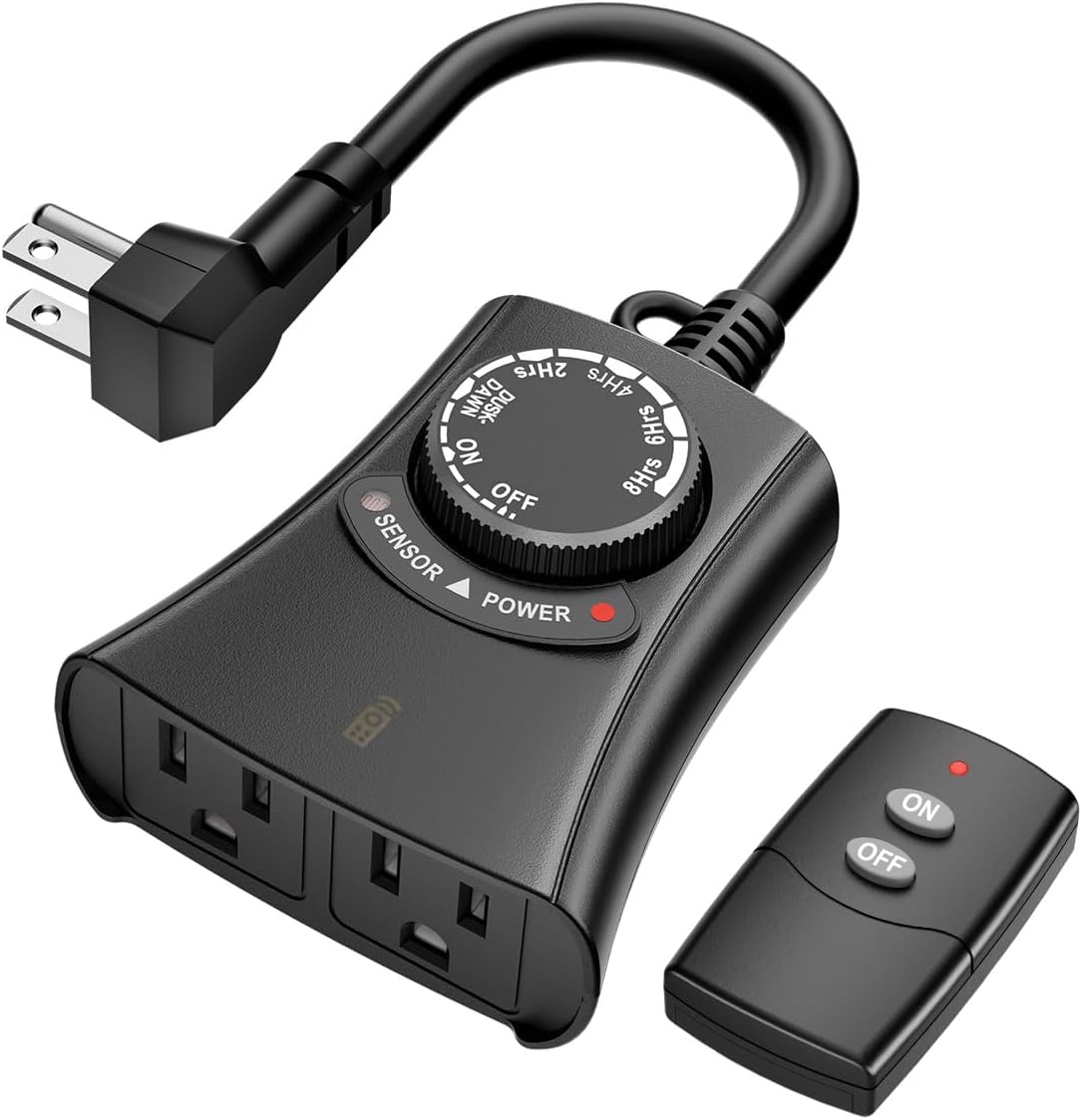 - ✅【Remote Control】This weatherproof outdoor timer includes a 6-inch cord and 2 grounded outlets. The remote control features a strong RF signal that can penetrate walls and doors, with a range of up to 100 feet in direct line of sight.