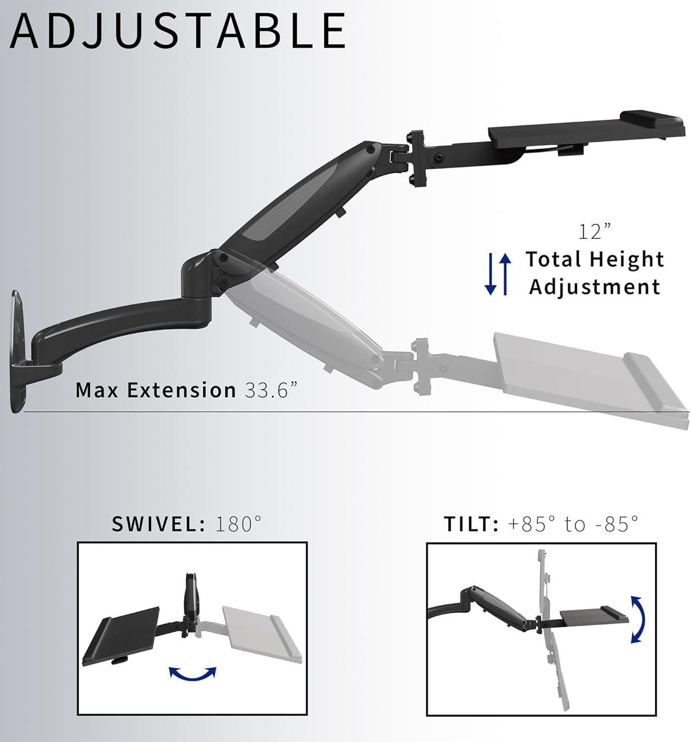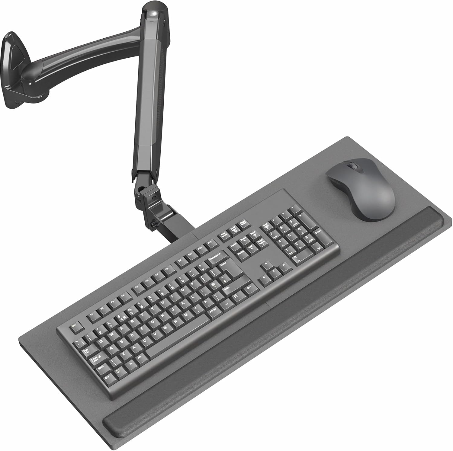 - Great for Floating Workstations - Adjustable wall-mounted 23.6” x 7” keyboard tray is the perfect addition to a wall monitor mount (sold separately) to create a floating workstation for quick standing access. The tray extends a total of 33.6” from the wall, creating an easily accessible platform for your keyboard and mouse.