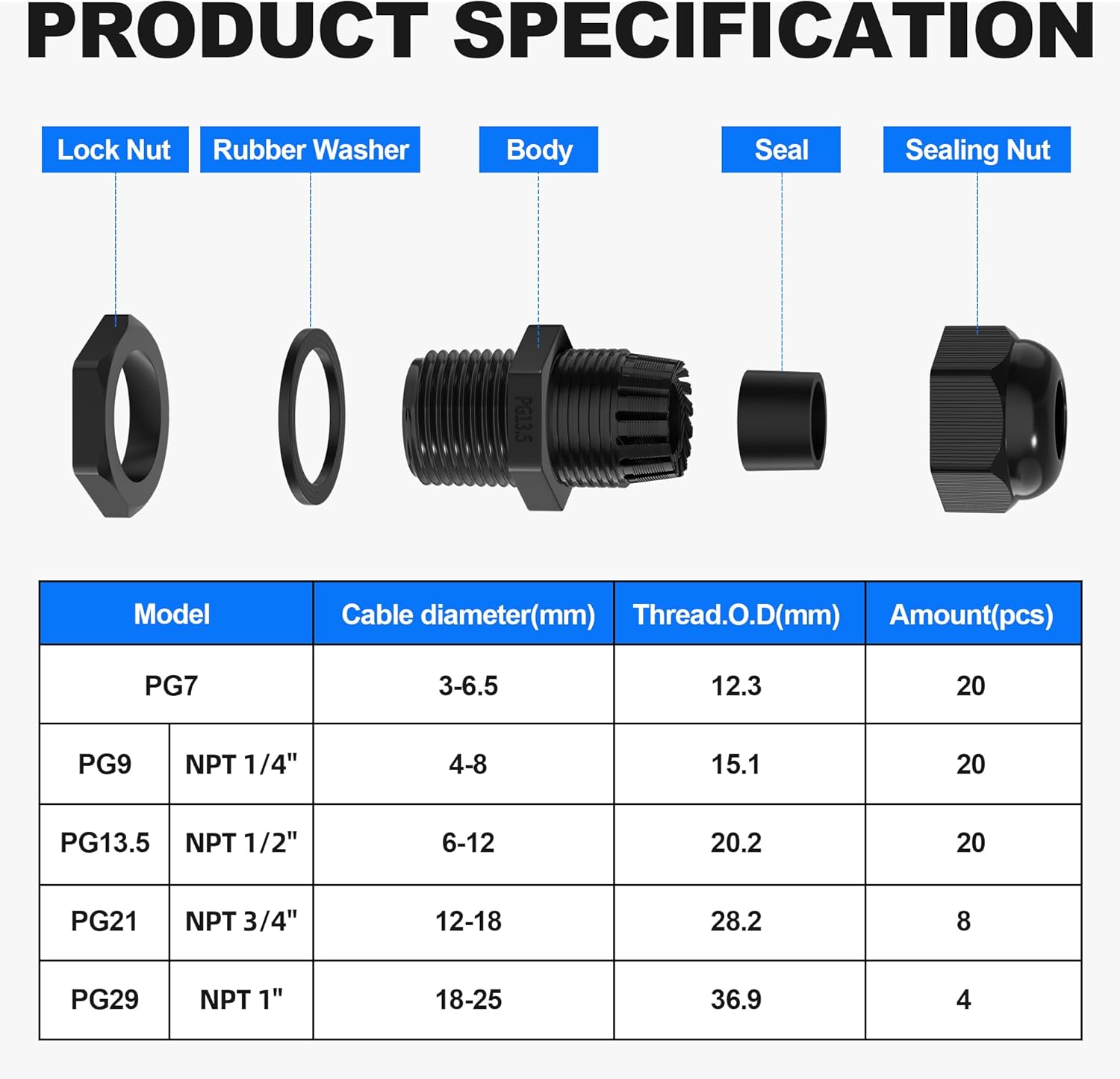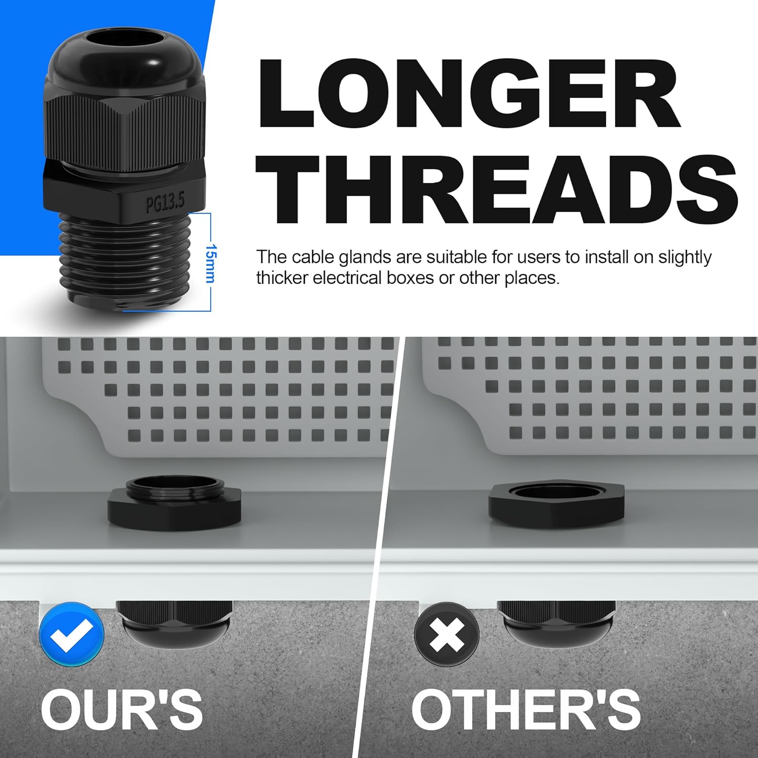 - ★LONGER THREAD★ The NPT cable glands Kit are designed with 15mm(0.6") long thread. It's much longer compared to others. More importantly, the cord grips are suitable to install on thicker electrical boxes or other place.