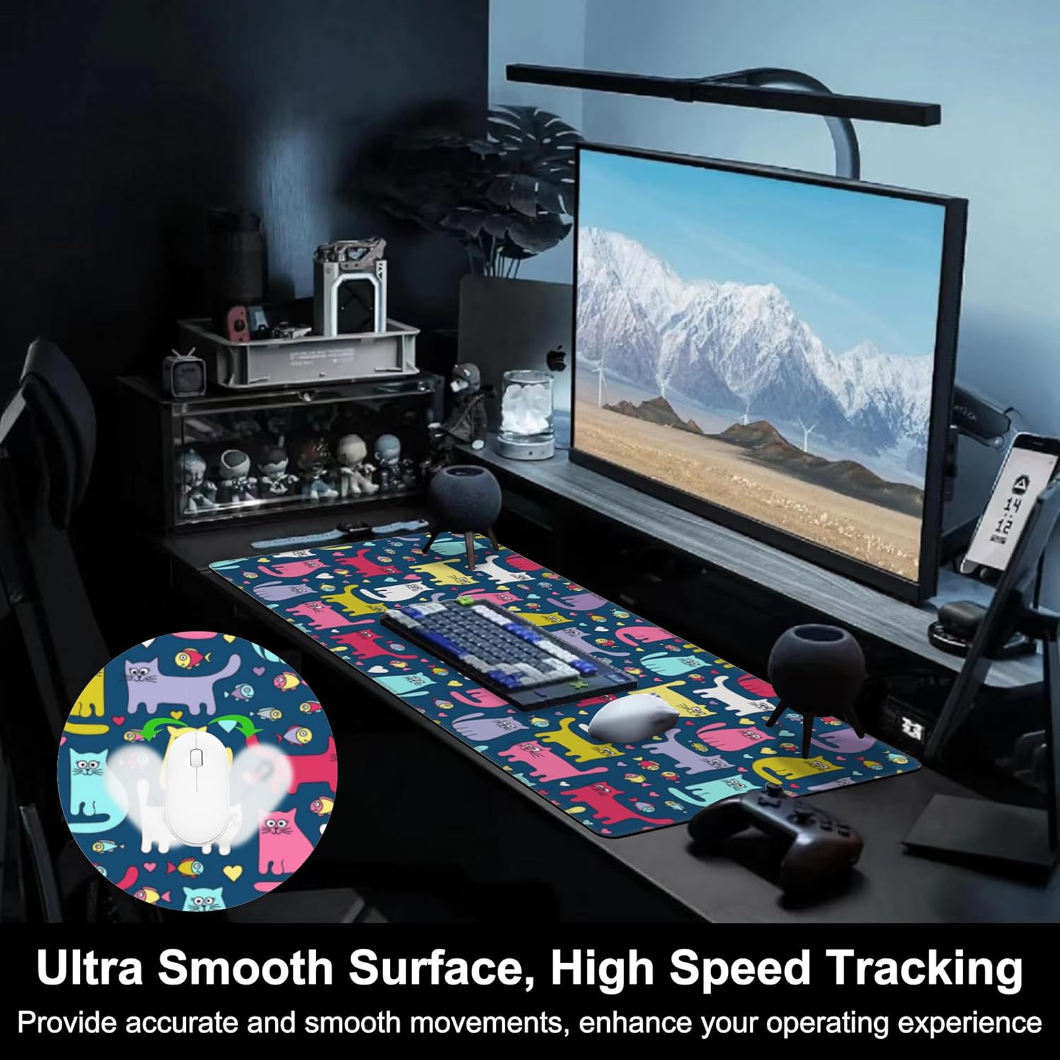 Mouse Pad, Large Cartoon Cats and Fish Desk Mat, Extended Non-Slip Gaming Keyboard Mousepad Desk Pad, Thick Stitched Edges Waterproof Mouse Mat 31.5"x15.7" (Funny Doodle Kittens)