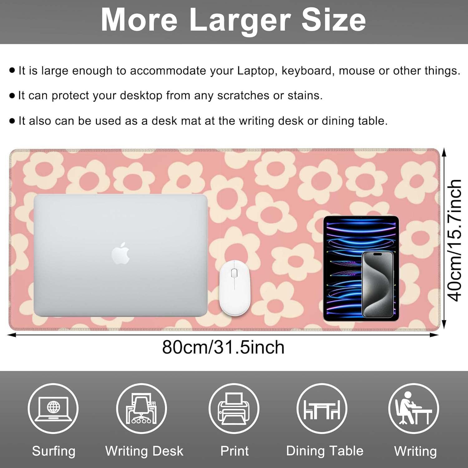 - ā„[Extended Size]The size of this mouse pad is 31.5"x15.7".It is large enough to accommodate your keyboard and mouse perfectly.What's more,you also can put your cups or other stuffs on it.The Large size ensures free movements of your mouse without any interruptions. Therefore,you don't have to continually adjust the mouse mat like the traditional one.It also can protect your desktop from any scratches or stainess.