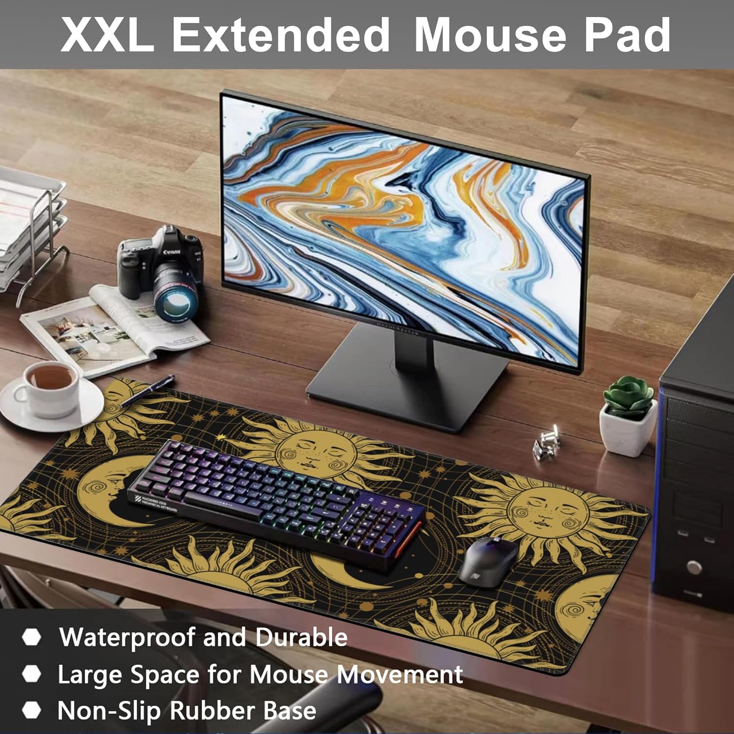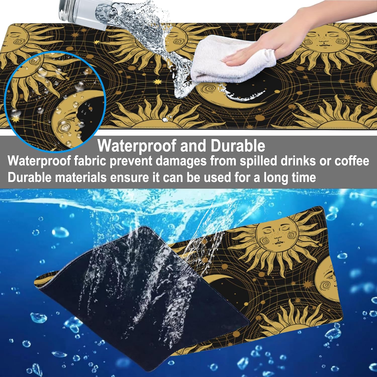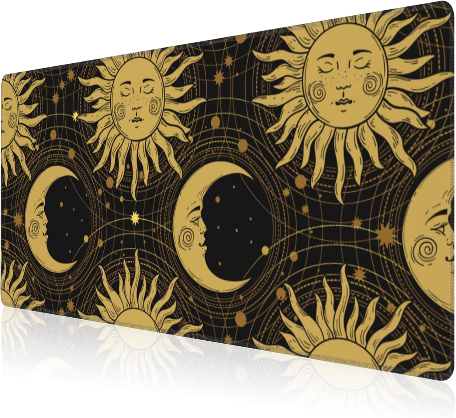 Mouse Pad, Large Golden Sun and Crescent Desk Mat, Extended Non-Slip Gaming Keyboard Mousepad Desk Pad, Thick Stitched Edges Waterproof Mouse Mat 31.5"x15.7" (Sun and Moon)