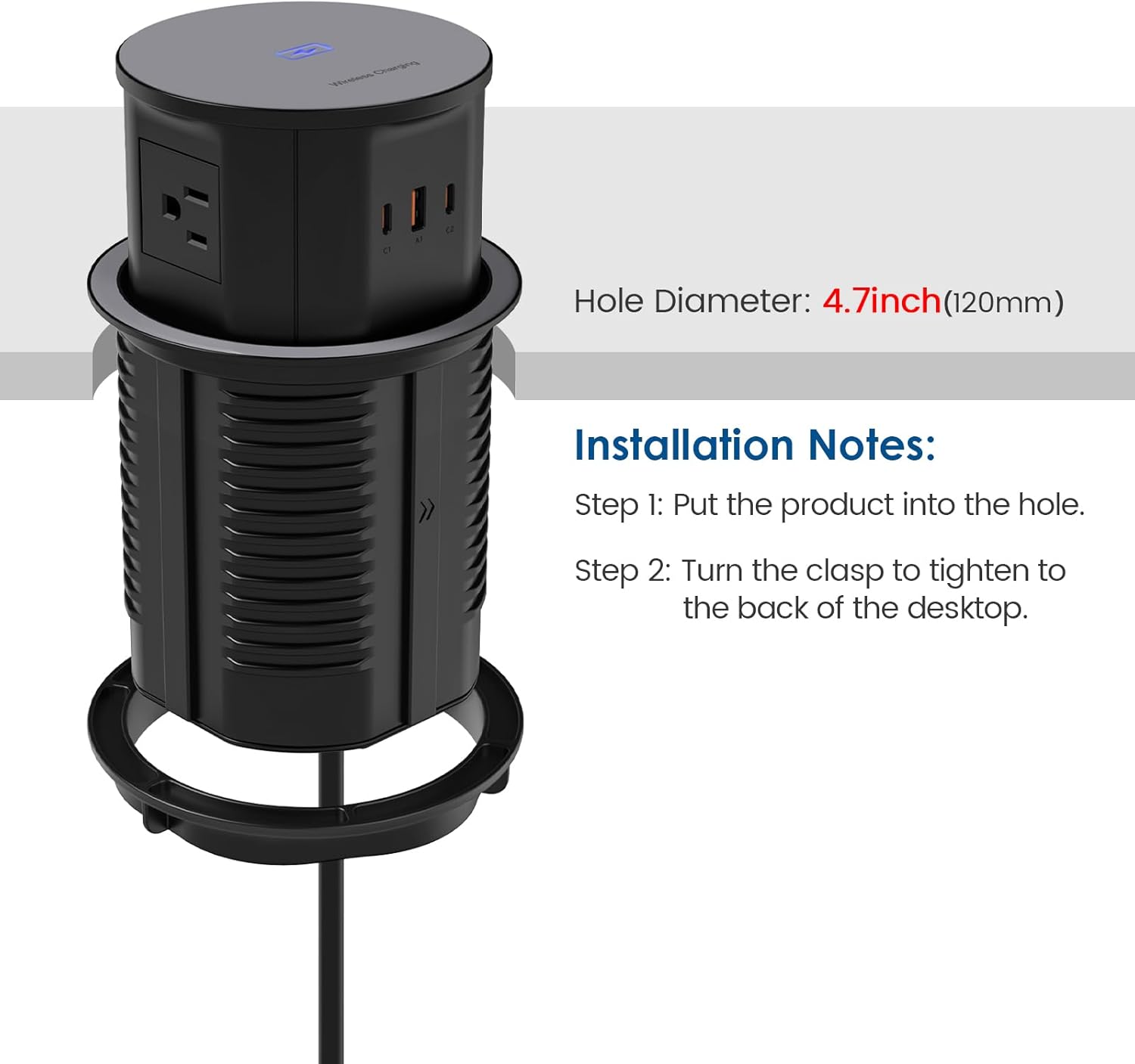 Pop up Outlet for Countertop with 15W Wireless Charger,65W USB C Charging Station,4 Outlets,2 USB C,USB A,Tamper Resistant Receptacle,4.7'' Hole Power Grommet,Office Power Supply,Black