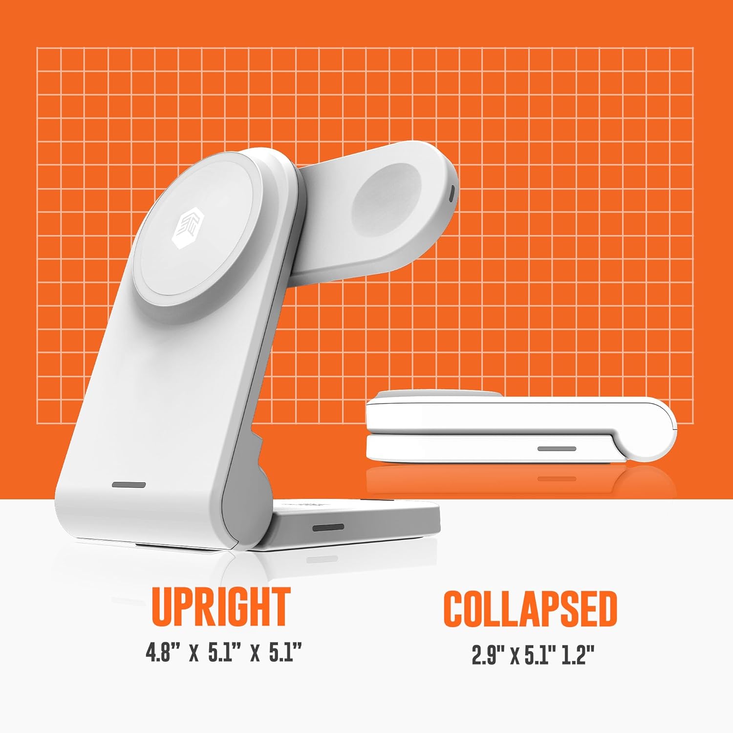 STM ChargeTree Mag: 3-in-1 MagSafe Wireless Charging Station for iPhone 16, 15, 14, 13, & 12 Series, Apple Watch, and AirPods - Foldable and Space-Saving Dock - White
