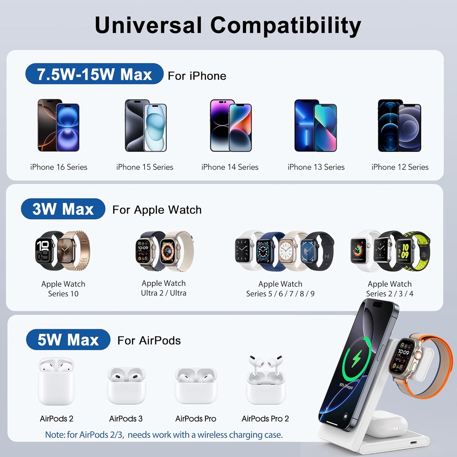 - 3-in-1 Charging Station: It’s an all-in-one wireless charging station for multiple devices. Now it's just need one wireless charger for iPhone 16/15/14/13/12 Mini/Plus/Pro/Pro Max Series. It can act as a wireless charger for AirPods 3 and AirPods 4 (with wireless charging case) and a magnetic wireless charger for Apple Watch 10/9/8/7/6/5/4/3/2/SE/Ultra(Note:This wireless magnetic charger is only suitable for iPhone 12 and above iPhones, while it is not suitable for Samsung, Xiaomi and other Android phones.)