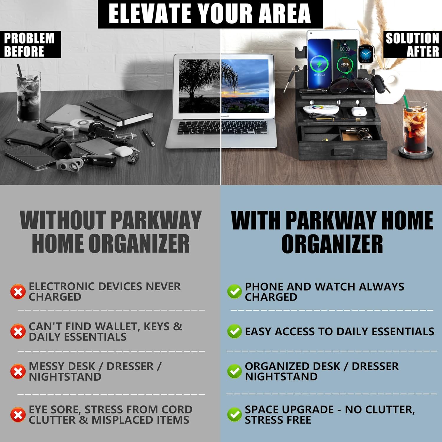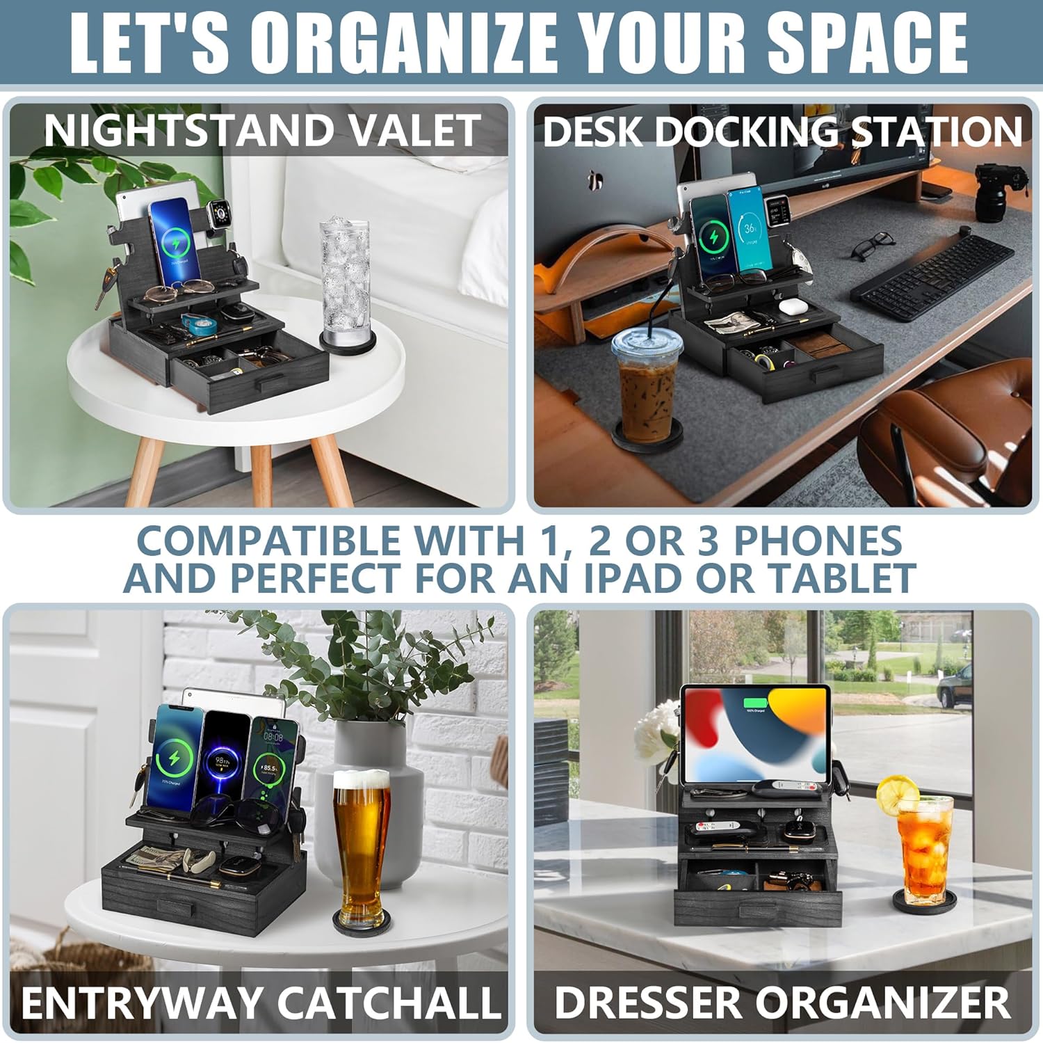 - 🔌TAKE CONTROL OF YOUR GEAR - AND YOUR LIFE: Tired of tangled wires? Had it with clutter and chaos? Check out this phone docking station for men and women; It keeps your phones and tablets charging, your cables neatly organized, and your everyday must-haves right there at your fingertips; So you can grab what you need when you need it