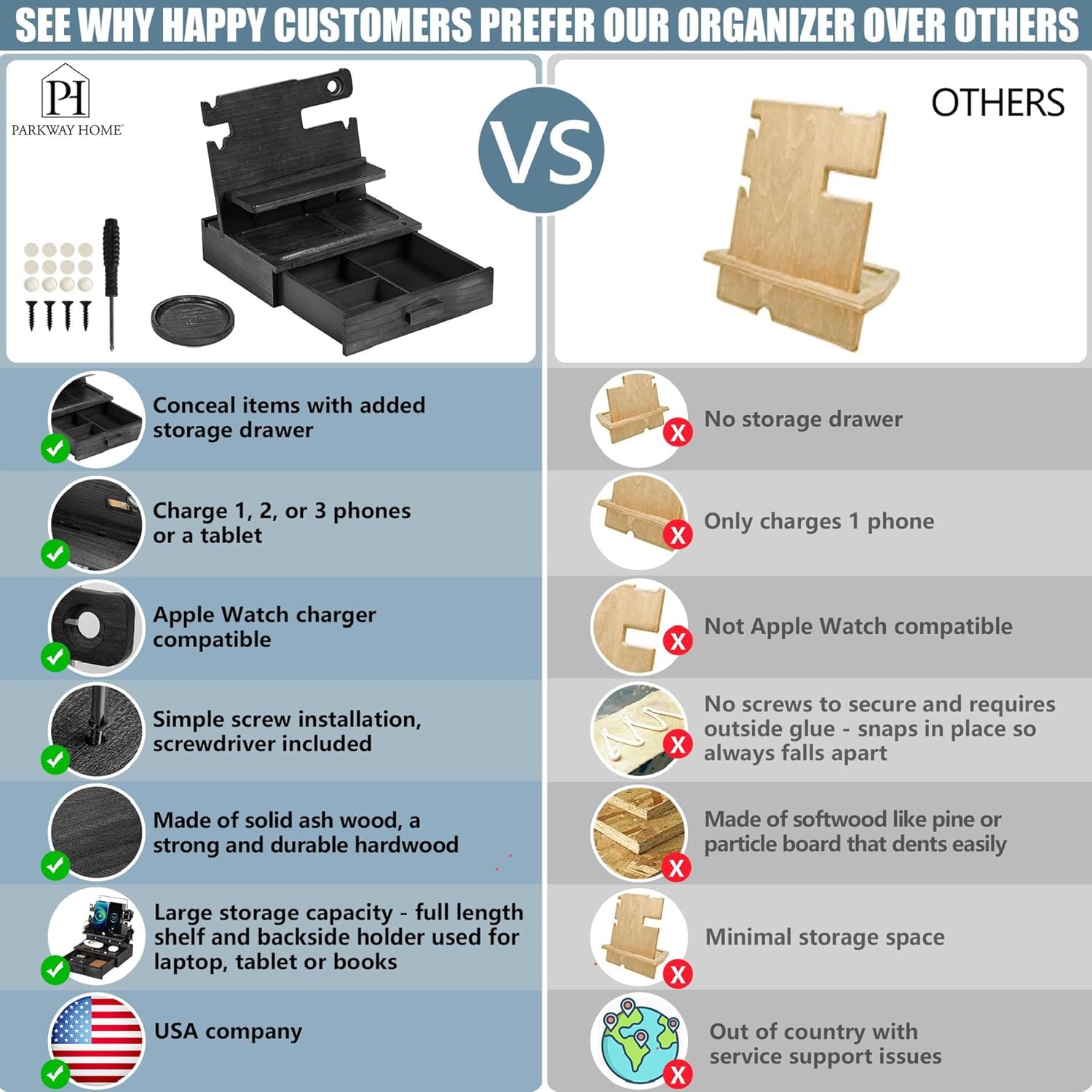- 🪵Carefully Constructed for Beauty and Durability: Forget cheaply made charging stands; We've crafted our men's docking station and organizer from premium solid ash, famous for rock-hard strength and gorgeous even grain; Choose from 2 versatile versions: with or without a spacious storage drawer; Note: This version comes with drawer