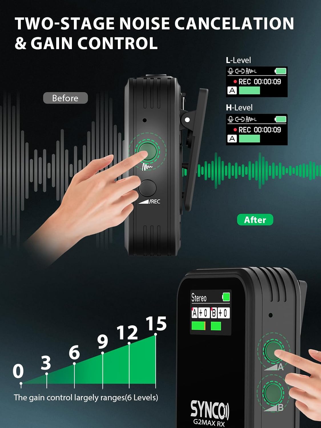 - Noise Reduction & Gain Control: SYNCO G2(A2) MAX could minimize or eliminate unwanted background noise or interference for clear and high-fidelity sound output by One-Touch Noise Cancellation. In addition, the gain control of this streaming microphone largely ranges 0-6 Level allow simple and effective optimization of signal levels, ensure lav mic captures a strong enough signal without being too quiet or too loud
