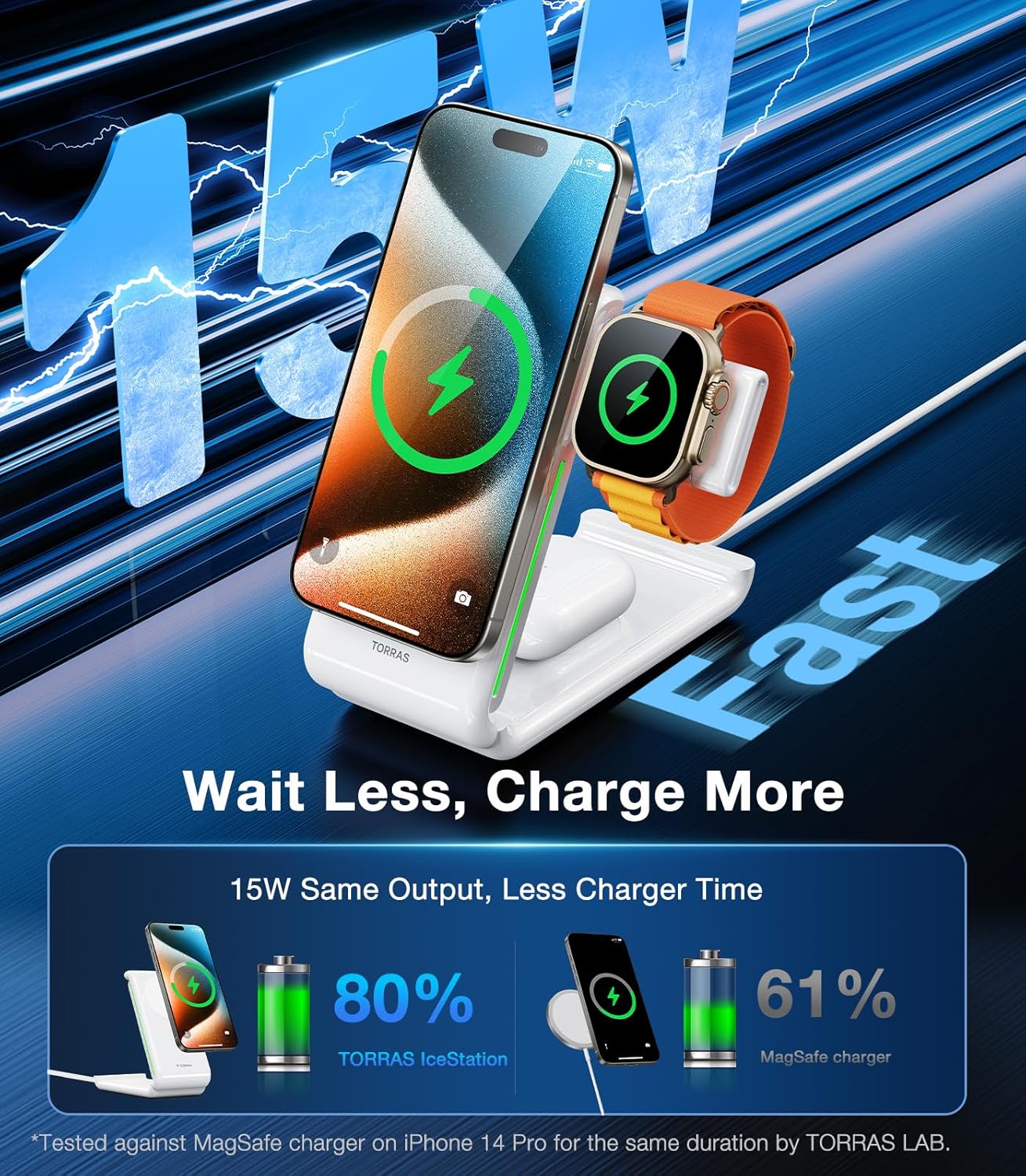 - 【Travel Without Clutter】Our 3-in-1 Magsafe charger folds to phone size, offering hassle-free convenience for business trips and travels. The detachable and portable USB-C watch charger lets you charge anytime, anywhere, with a magnetic cap design that eliminates worries about loss. Never fret about forgetting to charge your watch again! Lighten your travel load with TORRAS 3-in-1 charging station for multiple devices, eliminating the hassle of carrying three chargers and cables.