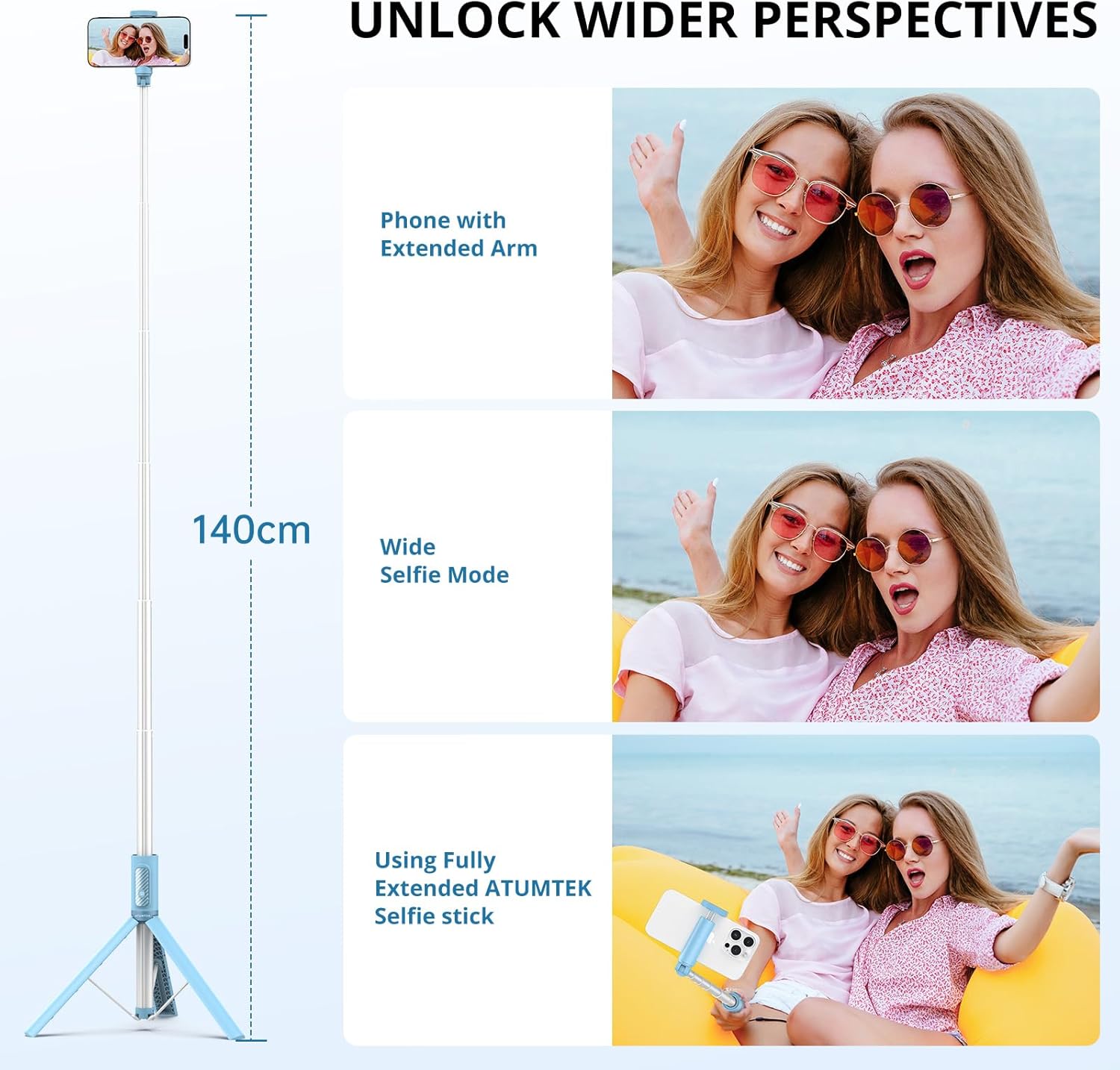 ATUMTEK 55" Selfie Stick Tripod, All-in-one Extendable Aluminum Phone Tripod with Rechargeable Bluetooth Remote for iPhone and More, Fit 4.7-7 inch Smartphones, Blue