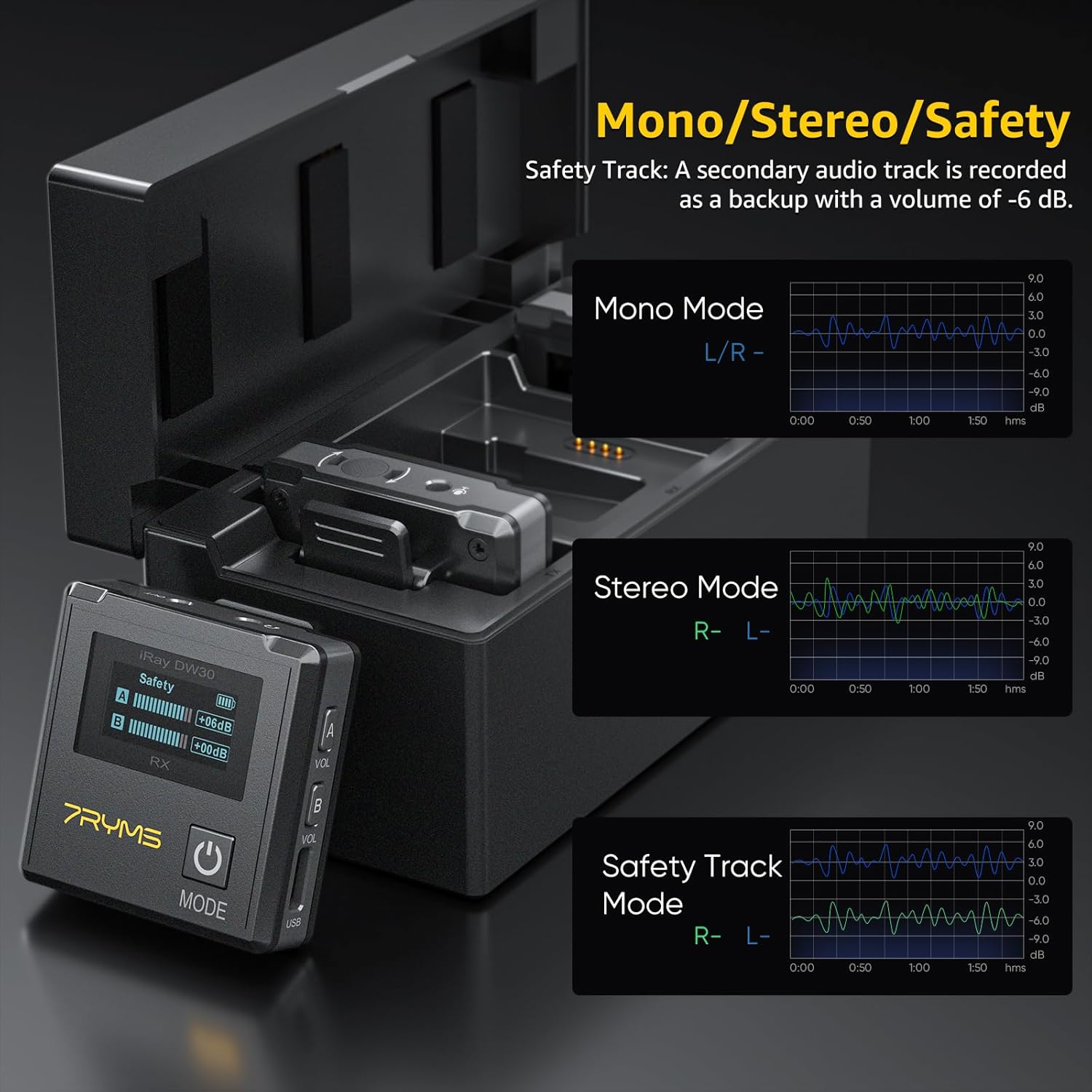 - ă16G Internal Recording StorageăThe iRay DW30 Wireless lavalier microphone with 16 GB internal storage, record up to 24 hours of audio as backup. Ensure the integrity of the recording data without worrying about losing audio.