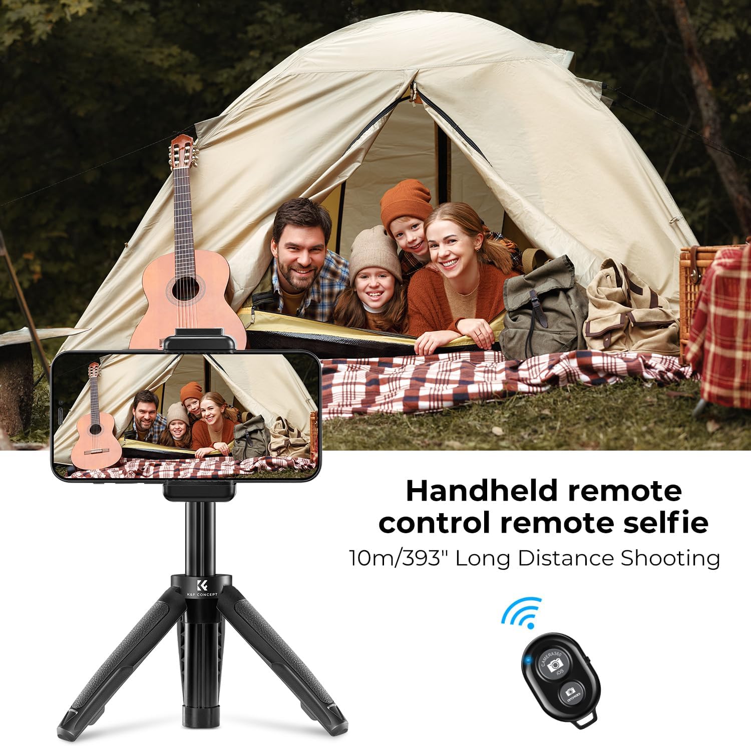 K&F Concept Selfie Stick Tripod, 360 Degree Rotation Mini Phone Stand with Ball Head and Cold Shoe Mount, Cellphone Holder with Wireless Remote for Smartphone Black