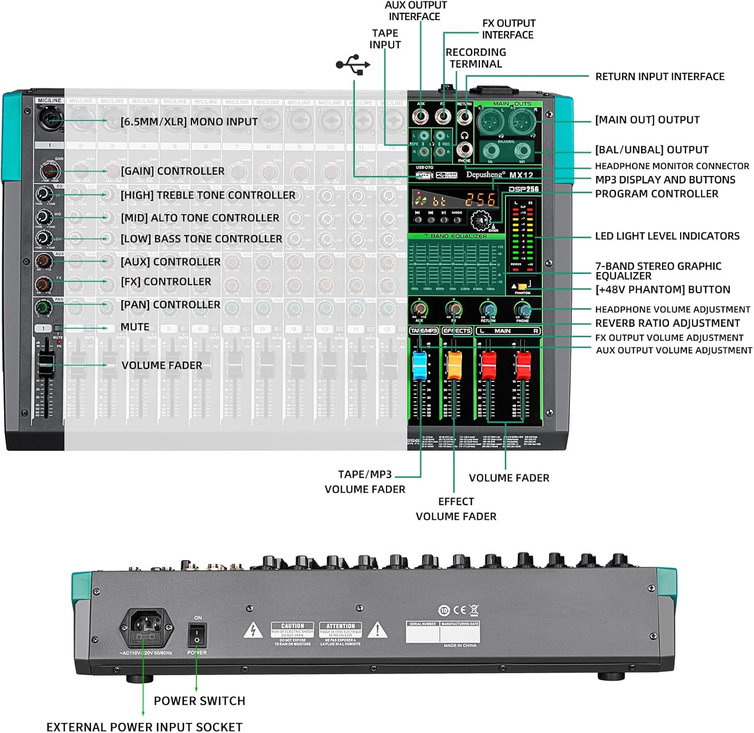 Depusheng MX12 12 Channel Sound Mixer Audio Mixing Console 48V 256DSP Professional USB PC Play Record Podcast Live Broadcast (US MX12)
