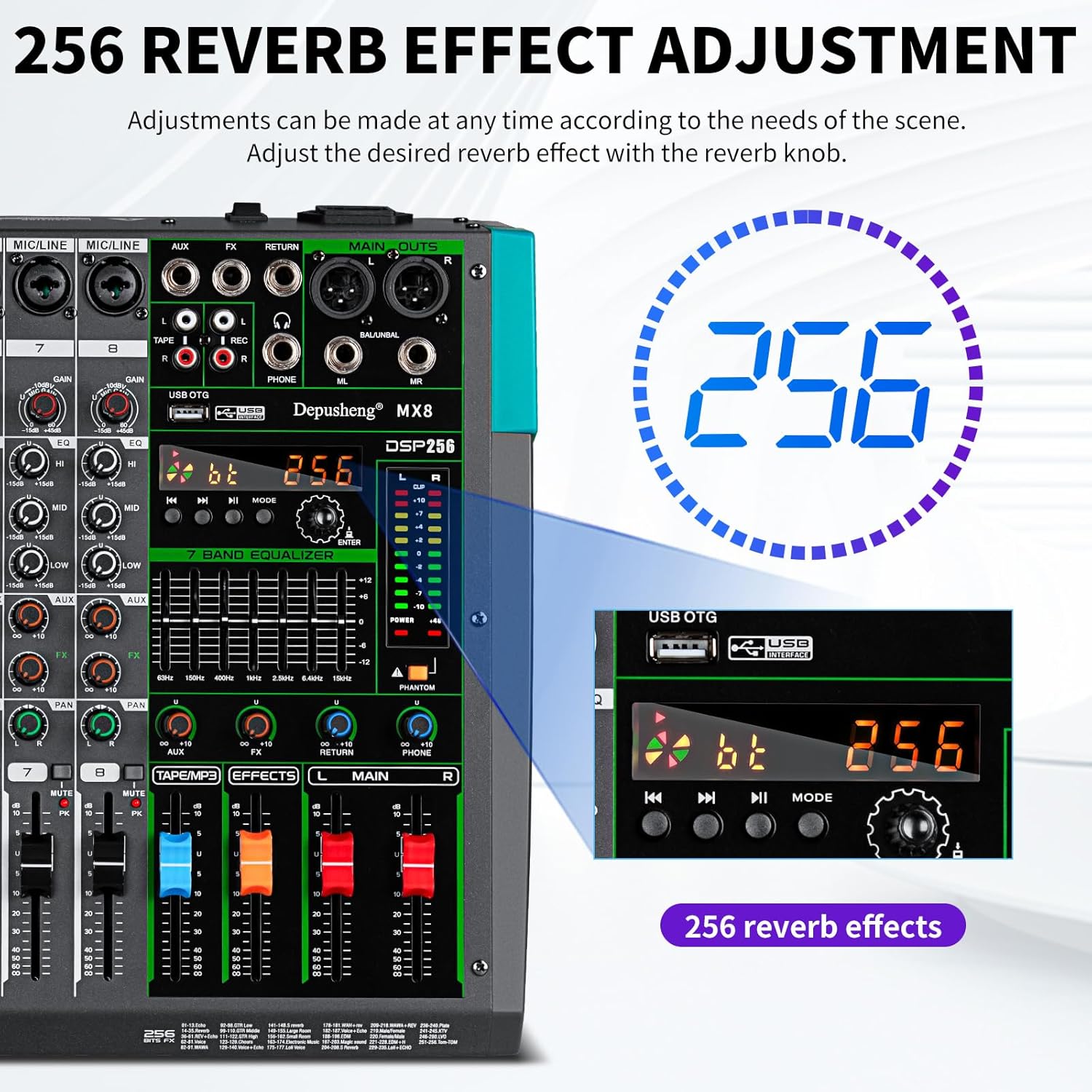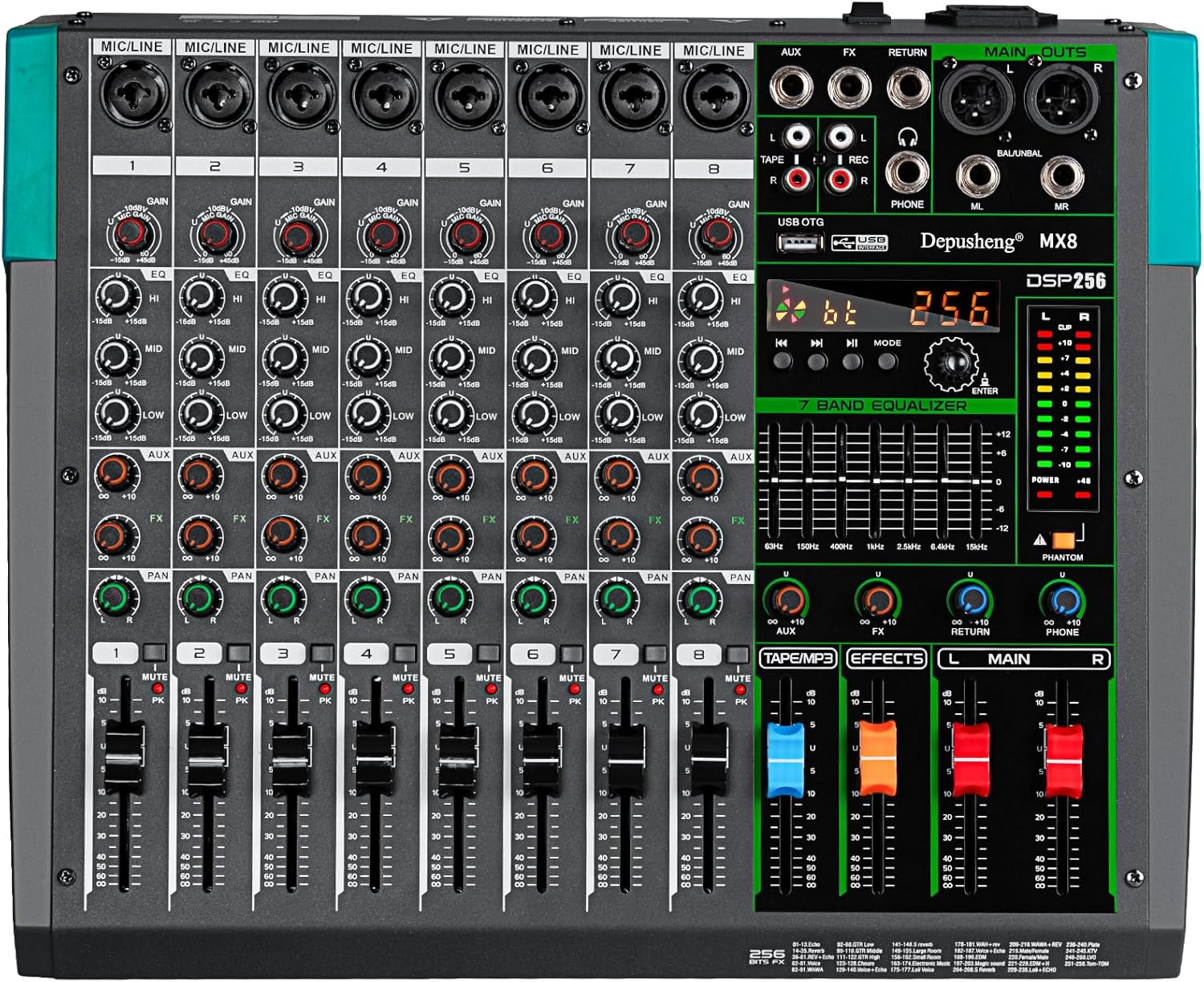 Depusheng MX8 8 Channel Sound Mixer Audio Mixing Console 48V 256DSP Professional USB PC Play Record Podcast Live Broadcast (US MX8)