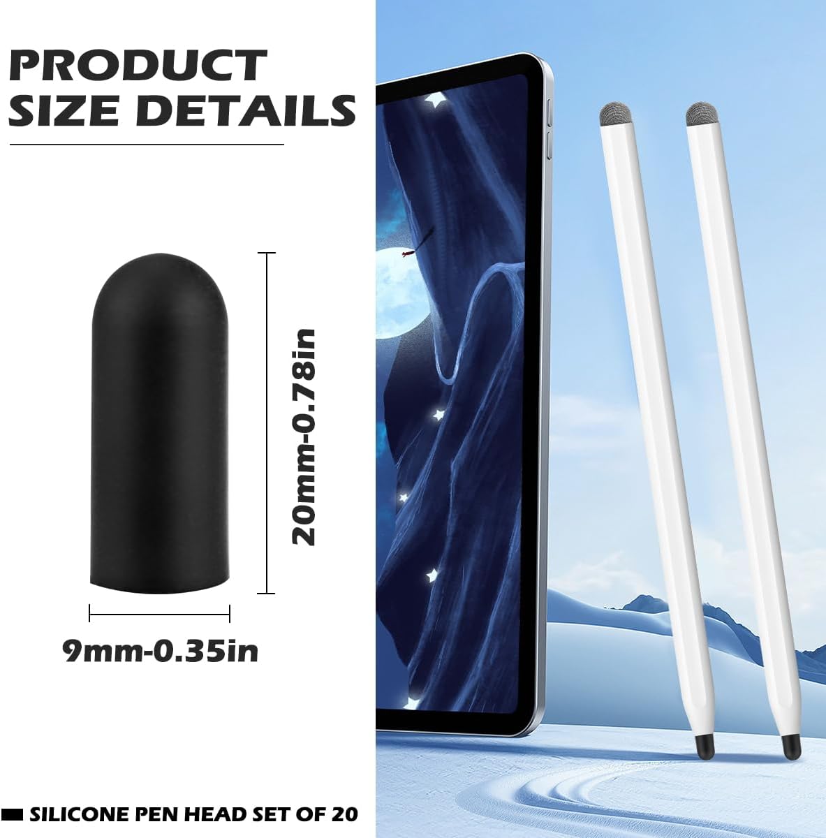 - Quantity and Size: The package contains 20 silicone tips with an outside diameter of 0.35 inches/9mm and an approximate height of 0.78 inches/20mm.