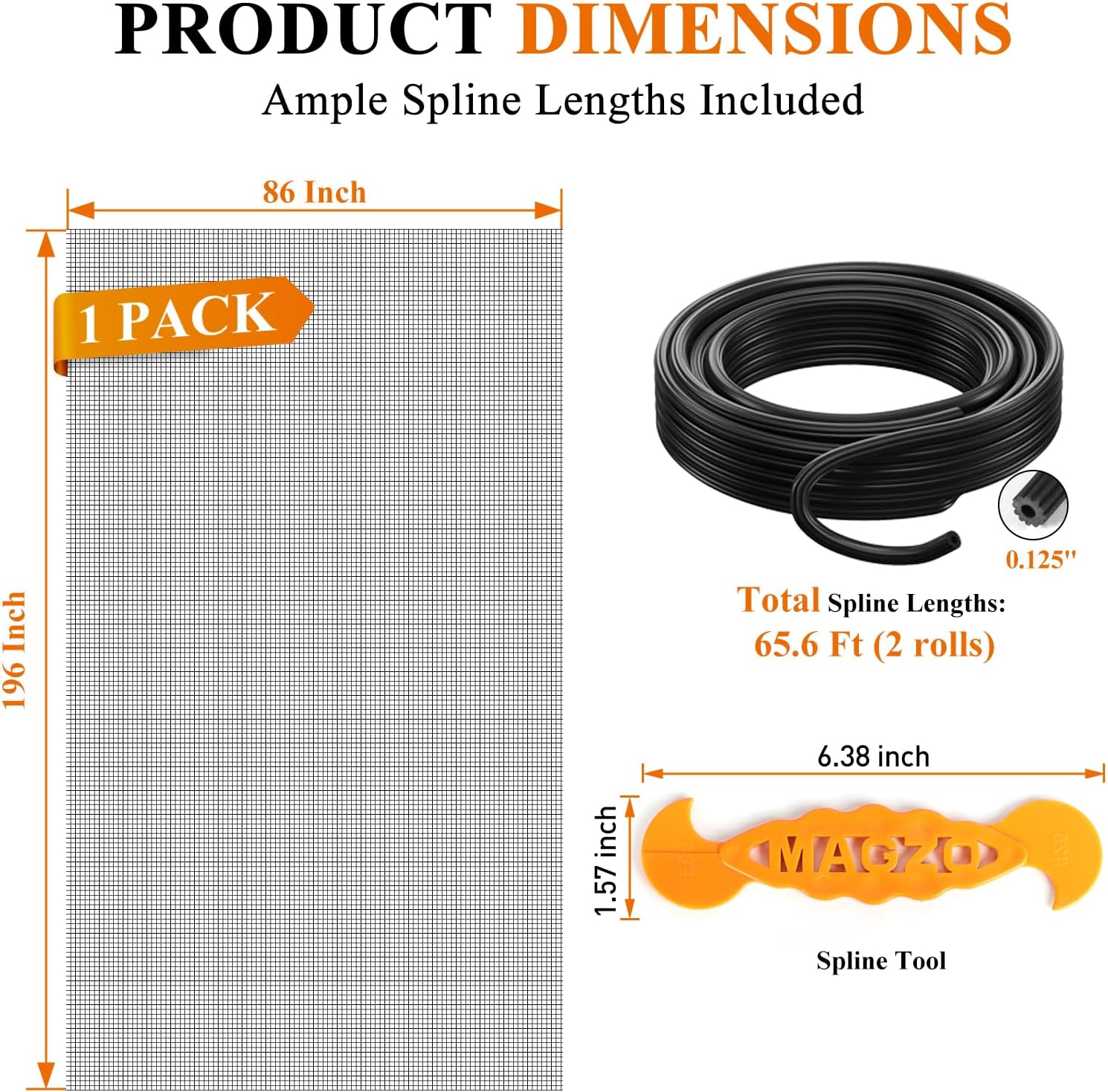 MAGZO Window&Door Screen Replacement Kit, 86" W x 196" L, with Retaining Spline(Total 65.6 FT) and Press-in Installation Tool, Polyester Scratch-Proof, Repair Adjustable Mesh for Windows&Doors, Black